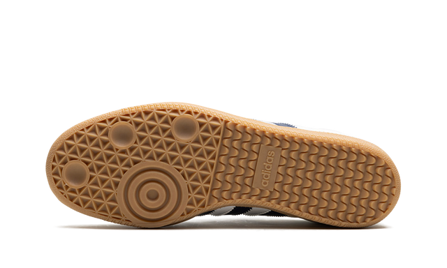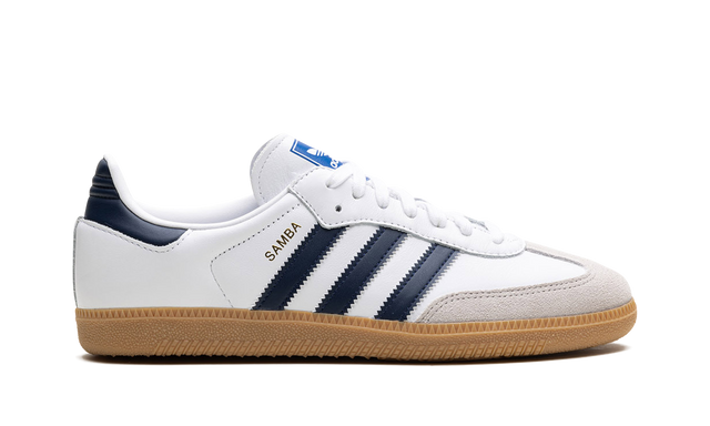 The adidas Samba OG "White/Night Indigo" is a colorway of the retro shoe with navy accents. The adidas Samba OG is one of the most popular sneakers in the world due to its versatility and comfort. Here, the “White/Night Indigo” features a white leather base and a grey suede overlay on the toe. The Three Stripes branding on the sides appears in a Night Indigo tone, while a gold foil “Samba” logo can be seen on the lateral side of the mid-panel. Classic adidas Samba detailing is printed on the tongue. A gum rubber sole completes the look.