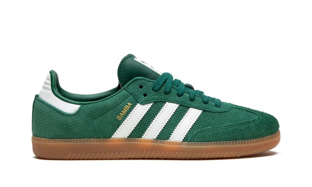 The adidas Samba OG "Collegiate Green/Gum" offers a classic yet fresh look with a combination of dark green and a signature gum sole. The upper is made from premium leather in "Collegiate Green," giving it a luxurious and dynamic feel. Contrasting white stripes on the sides, combined with a white heel, highlight the traditional Samba design. A durable brown gum sole not only provides stability but also brings a warm and classic look, completing a pair of shoes that are both fashionable and easy to coordinate.