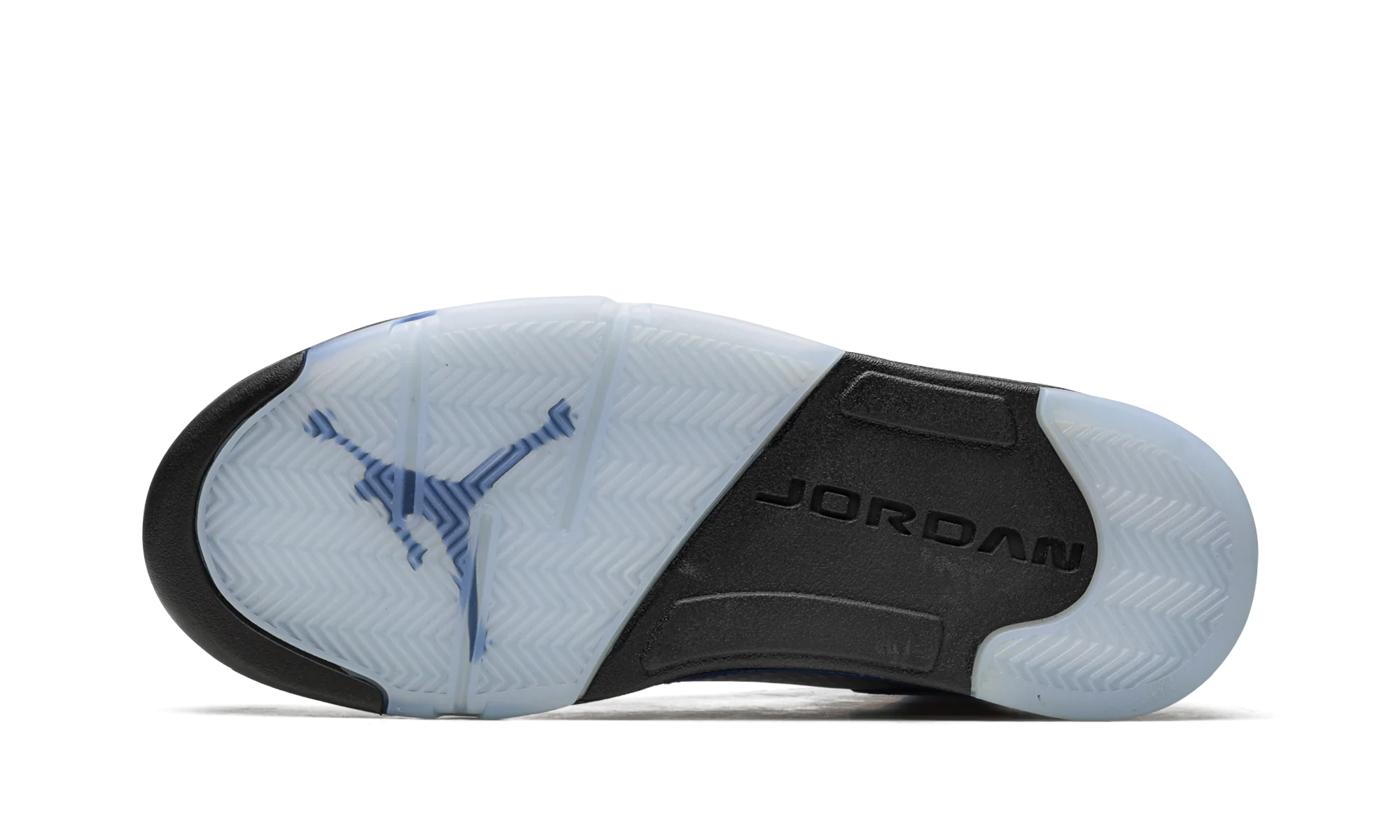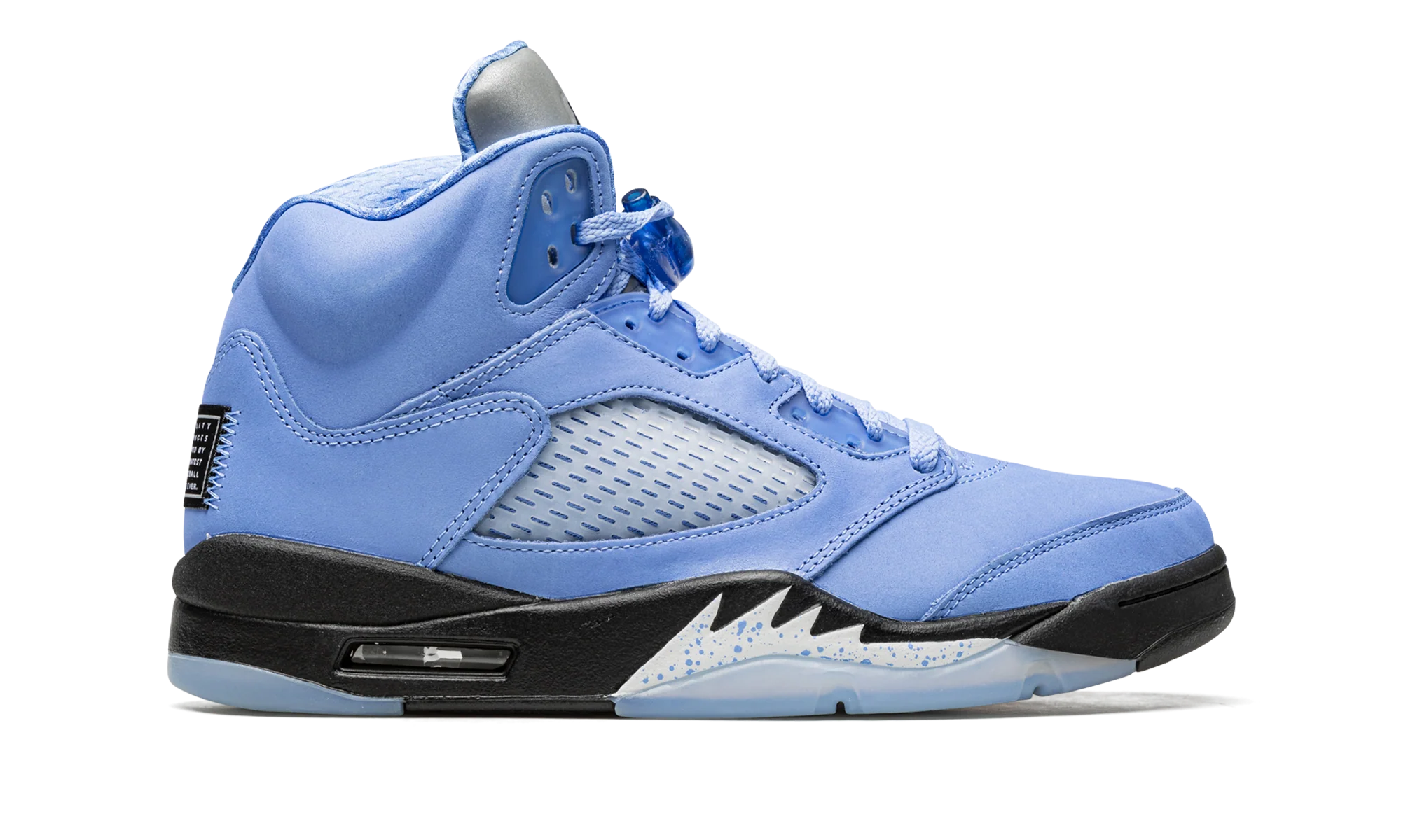The Air Jordan 5 “UNC” is a colorway of the retro basketball shoe in a colorway inspired by Michael Jordan’s alma mater, the University of North Carolina. The “UNC” Jordan 5 is not affiliated with the UNC Tar Heels, but nonetheless draws inspiration from the school and its college basketball team. The upper is designed in a University Blue nubuck construction with translucent netting on the tongue and mid-panel. A Jumpman is embroidered on the reflective Metallic Silver tongue. The heel is updated with a Team Jordan patch stitched on each shoe, while the model’s signature icy clear outsole is paired with a black midsole that features silver shark tooth detailing.