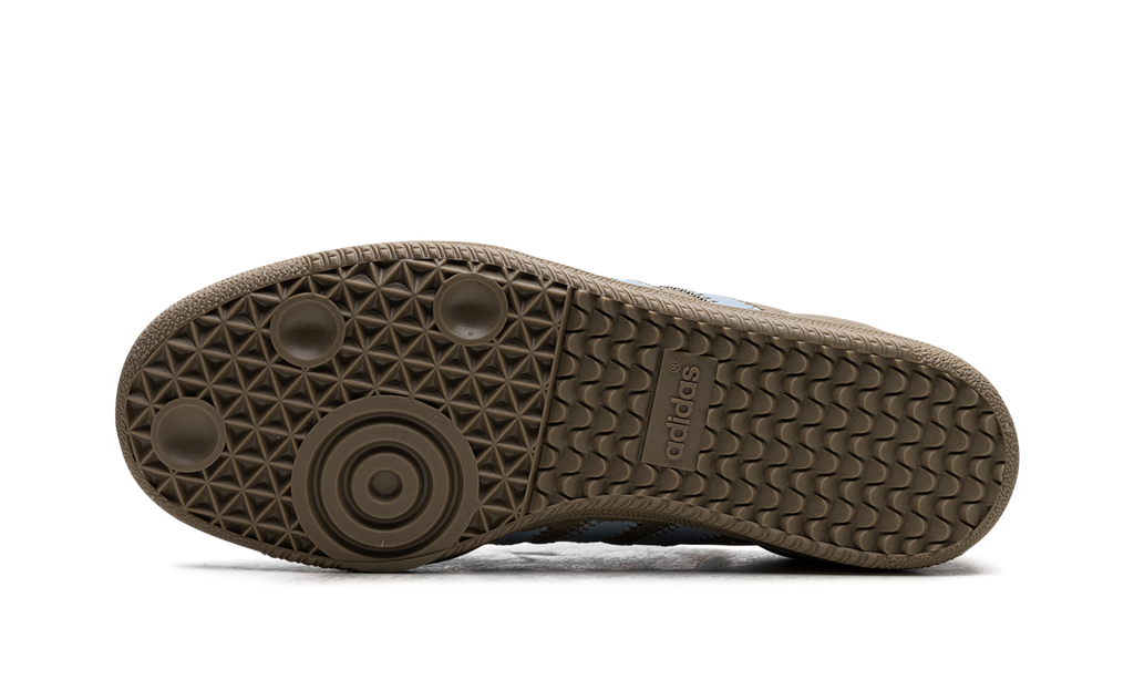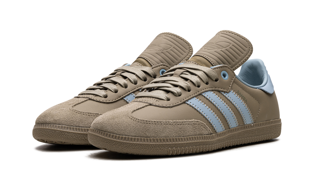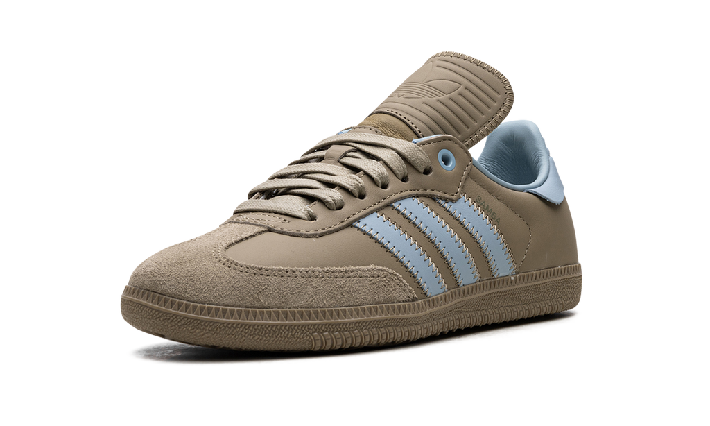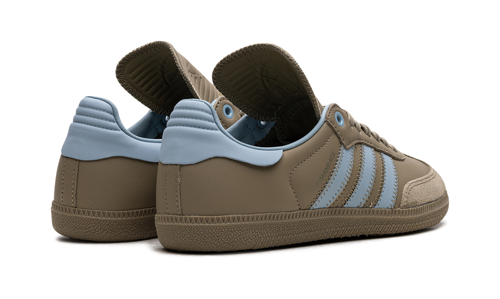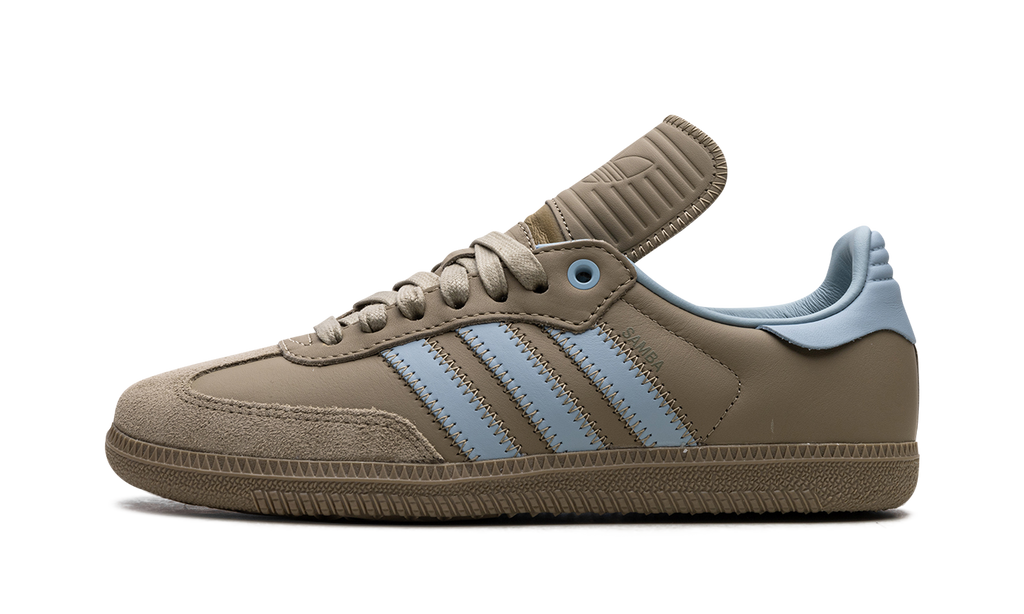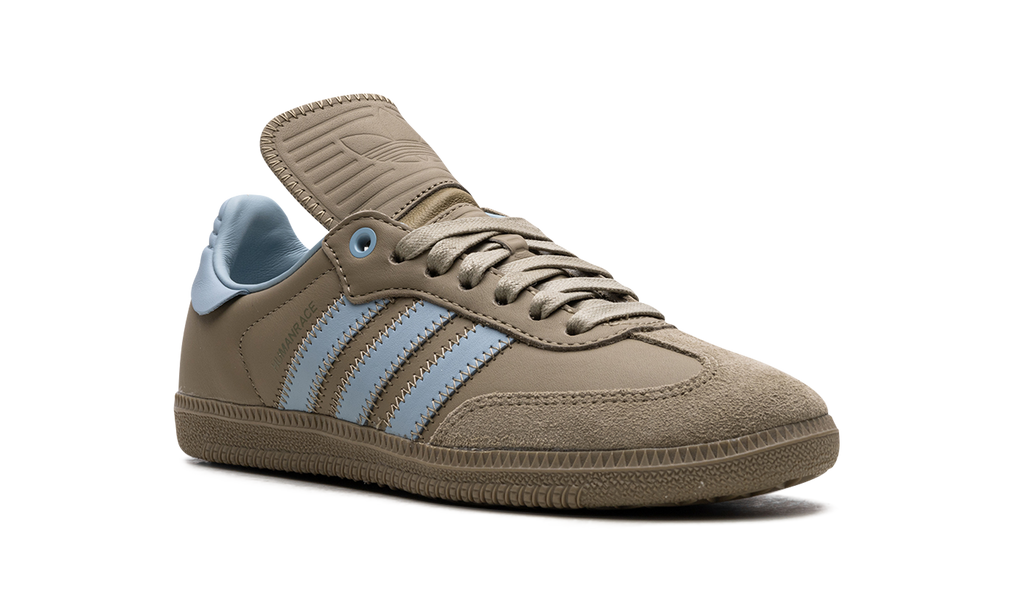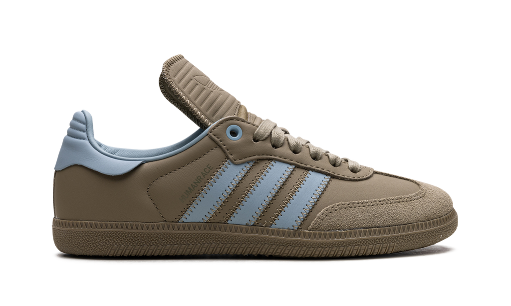 The Pharrell x adidas Samba Humanrace "Orbit Green" is a collaboration by Pharrell’s lifestyle brand and adidas on an earth tone colorway of the retro soccer shoe. From a Fall 2023 collection between Humanrace’s collaboration with adidas, the “Orbit Green” version of the Samba Humanrace features an muted olive green leather upper that has a tonal suede overlay on the toe. Contrasting light blue “Three Stripes” branding is seen on either side of the shoe. More blue accenting can be seen on the leather heel tab on the back. Underfoot, an Orbit Green-colored rubber sole completes the look. Release date: November 3, 2023