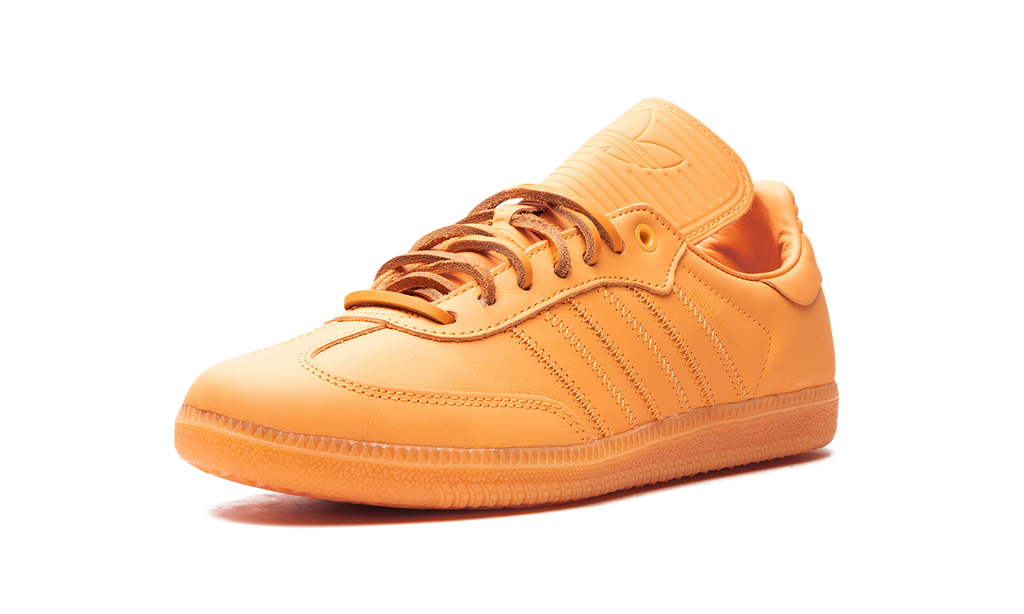 The Humanrace x adidas Samba “Orange” is a collaboration by Pharrell Williams’s lifestyle brand and adidas on a monochromatic orange colorway of the old school soccer shoe. From a greater collection of Sambas designed in a rainbow of monochromatic colorways, the “Orange” is complete with an orange leather upper that features tonal leather overlays and Three Stripes branding. A “Humanrace” logo is found on the side. An elongated tongue gives the Samba by Humanrace a vintage soccer shoe aesthetic. Brown leather laces contrast the design. The shoe is mounted on an orange rubber sole. Release date: May 6, 2023