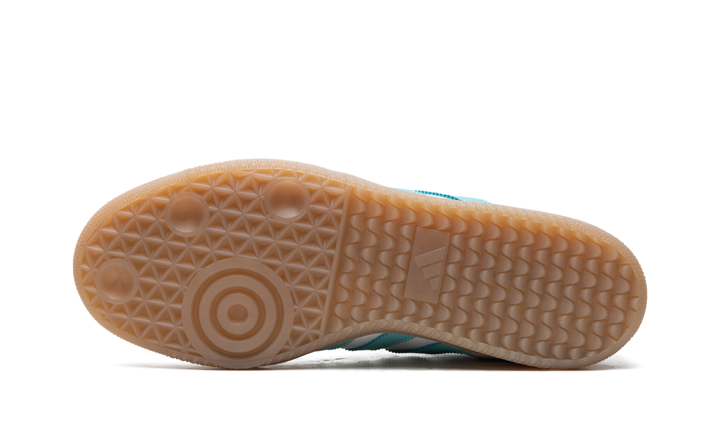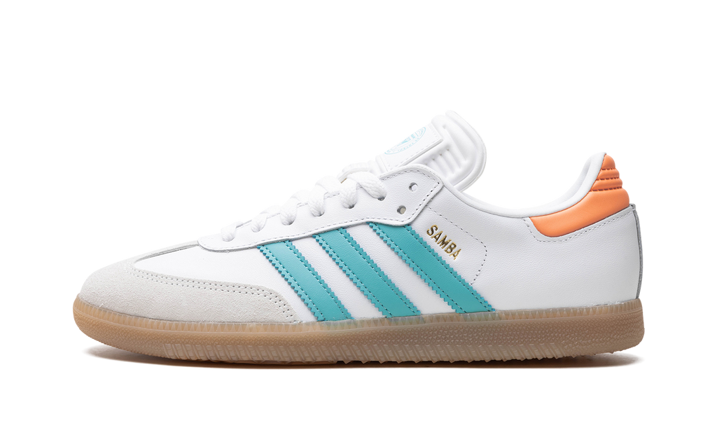 The adidas Samba “Inter Miami - Easy Mint/Pink” is a colorway of the popular sneaker inspired by the Major League Soccer team Inter Miami CF. Also said to be inspired by Inter Miami’s star player Lionel Messi, the “Inter Miami - Easy Mint/Pink” features the colors of the Miami-based team on its design. The upper has a white leather construction with Easy Mint leather Three Stripes branding. A gold “Samba” logo appears on the lateral side of the mid-panel, while detailing inspired by Inter Miami is located on the tongue. A semi-translucent, smoky Gum rubber sole completes the look.