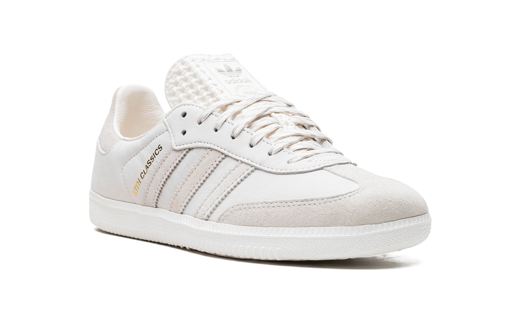 The Kith x adidas Samba “Classics Program - Cloud White” is a collaboration by Ronnie Fieg’s sneaker boutique on the popular sneaker. The upper features a Cloud White leather construction with Orbit Grey suede overlays on the toe and heel tab. Additional Orbit Grey suede can be found on the Three Stripes branding on the sides. A gold “Kith Classics” logo is printed on the lateral side of the mid-panel, and “Kith” and “adidas” branding can be found on the heel of the left and right shoe, respectively. A textured white rubber sole completes the look.