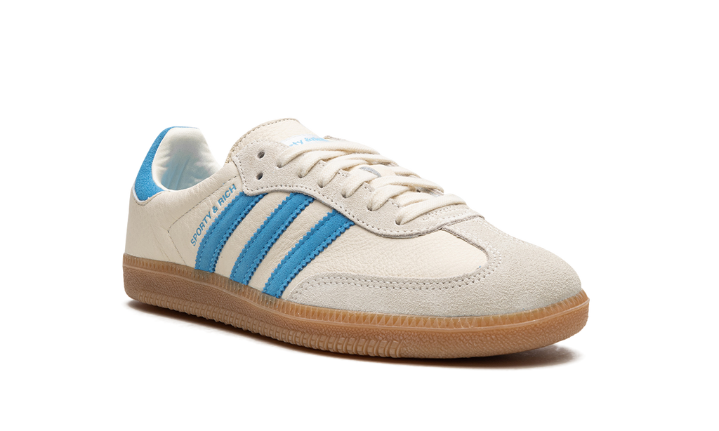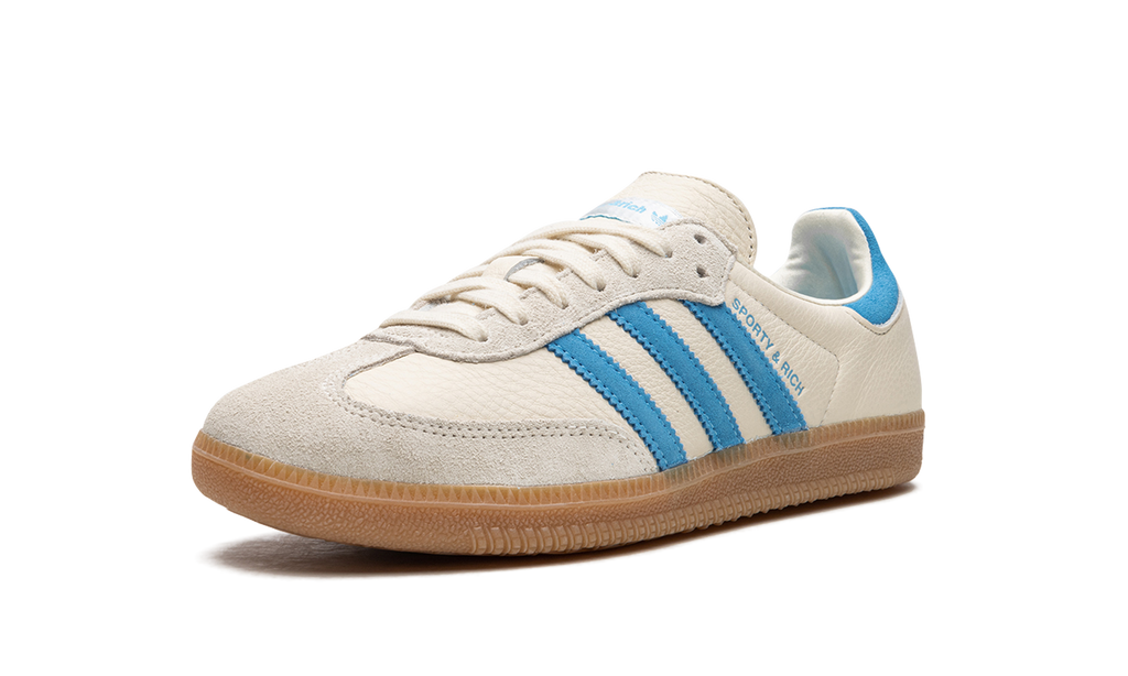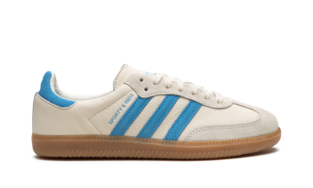 The Sporty and Rich x Women’s adidas Samba “Cream/Blue” is a women’s-exclusive colorway of the popular retro indoor soccer model from the collaboration by Emily Oberg’s sportswear brand. The Sporty and Rich Samba features a cream leather construction with a tonal suede toe overlay. A blue suede Three Stripes logo is found on the sides next to a blue “Sporty and Rich” logo. Dual “adidas” and “Sporty and Rich” detailing appears on the heel tab. Classic adidas Samba branding is located on the tongue. A gum rubber sole completes the clean design. Release date: May 4, 2023