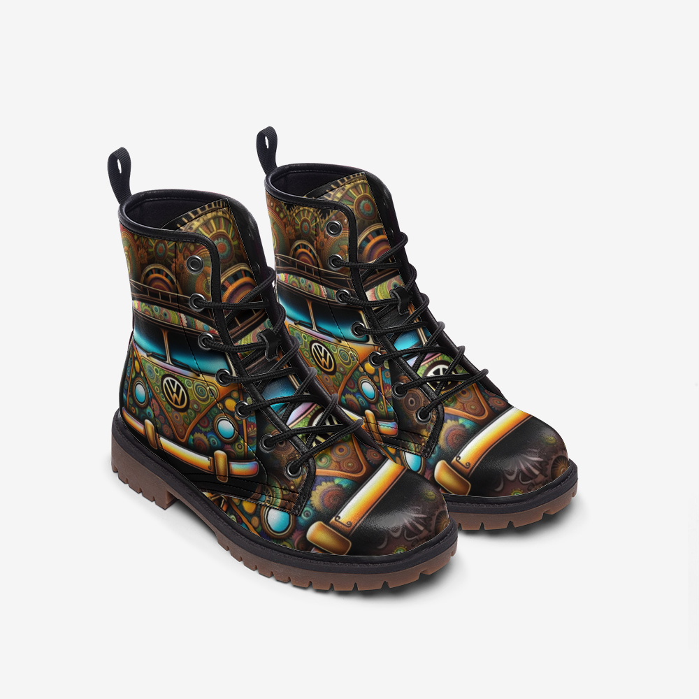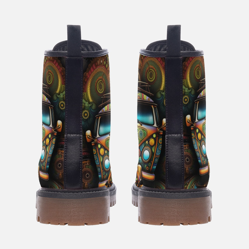 Hit the road in style with Emerald Blossoms' Groovy Hippie Van Casual Leather Lightweight Boots. Featuring a vibrant, retro graphic of a classic hippie van, these boots are a nod to carefree adventures and nostalgic vibes. Crafted from soft, lightweight leather, they offer superior comfort and flexibility for all-day wear. Perfect for those who cherish a blend of retro charm and modern comfort, these boots bring a fun, groovy touch to any outfit. Step out with a spirit of adventure and let your unique style roll with every stride!