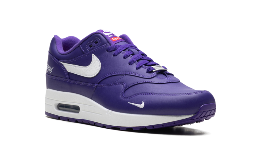 The Supreme x Nike Air Max 1 '87 SP takes Tinker Hatfield's 1987 masterpiece and gives it a vibrant, updated look with exclusive detailing from the renowned streetwear giant. The 'Varsity Purple' colorway delivers a striking, classic athletic feel with its high-contrast color blocking.