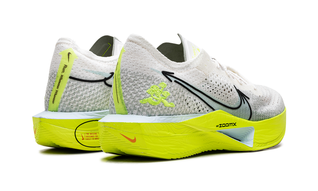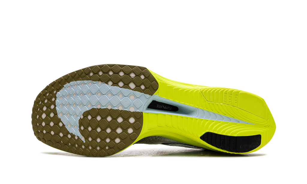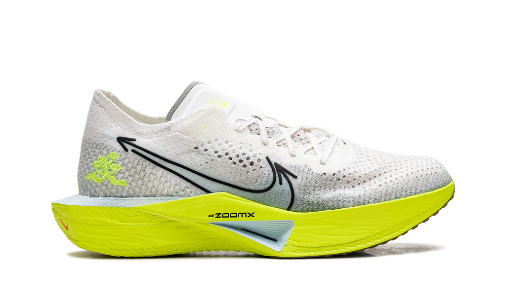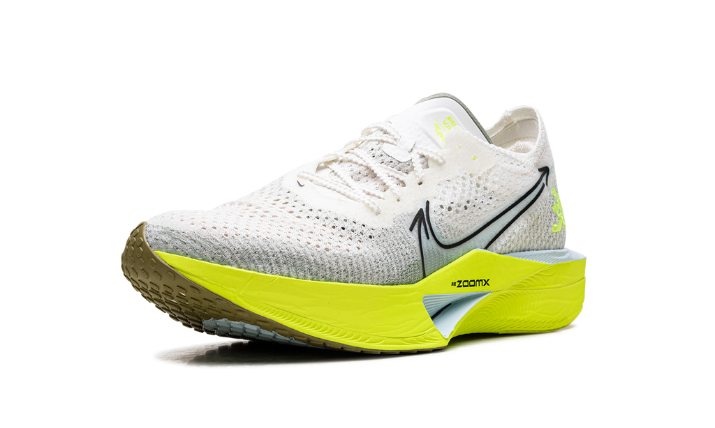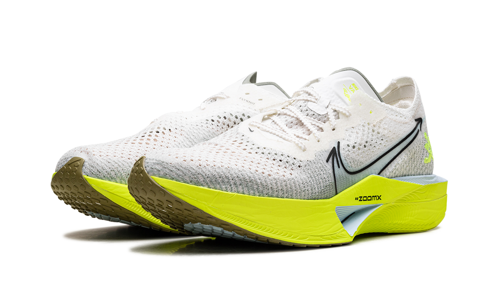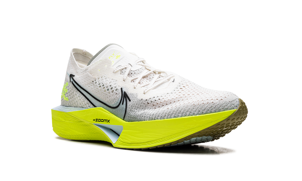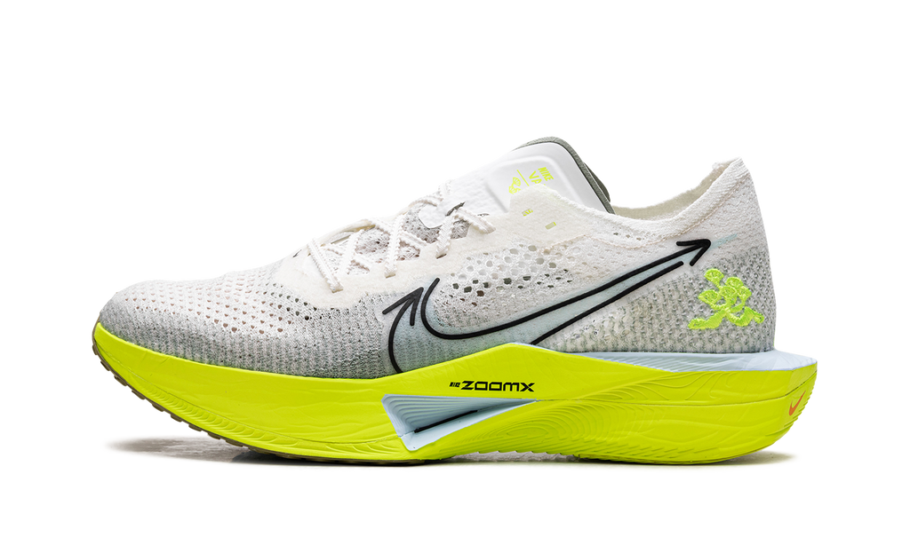 The style code HQ3450-147 is for the Nike ZoomX Vaporfly 3 Men's Road Racing Shoes in the bold, performance-ready 'Sail/Volt/Pacific Moss/Glacier Blue' colorway. This is the third iteration of Nike's premier "super shoe," engineered to deliver maximal speed and energy return for race day.