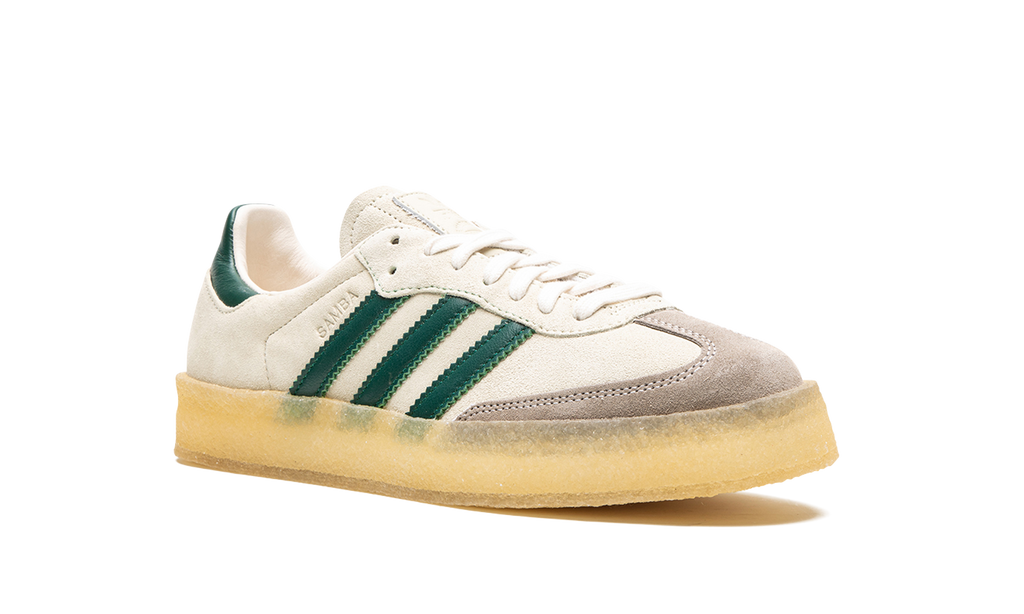 The Ronnie Fieg x Clarks x adidas 8th Street Samba “White/Green” is a three-way collaboration by the popular sneaker designer, the heritage footwear company, and adidas on a unique construction for the classic shoe. A collaboration that brings together three of the most respected names in footwear, the adidas 8th Street Samba co-designed by Ronnie Fieg and Clarks features elements of the adidas Samba mixed with the recognizable Clarks crepe sole. The upper has an off-white-colored suede design and green leather Three Stripes branding on both sides. A “Samba” logo can be found on the lateral side of the shoe and a co-branded patch is seen on the tongue. Underfoot, a semi-translucent crepe sole completes the look. Release date: March 24, 2023