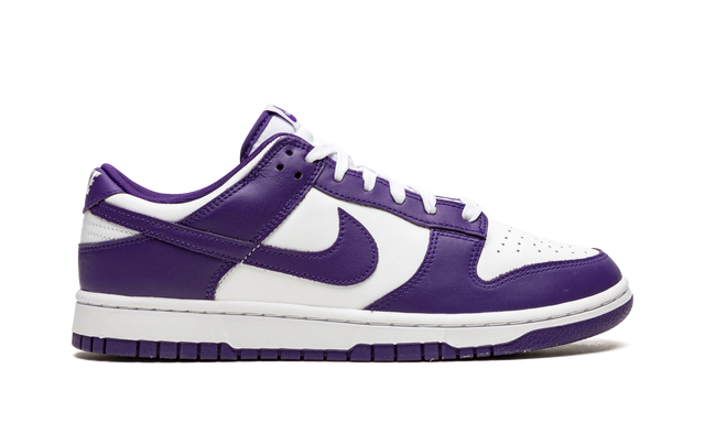 The Nike Dunk Low “Court Purple” is a two-tone, white-and-purple colorway of the retro basketball shoe that was released in 2022. The “Court Purple” Dunk Low features a white leather base with contrasting Court Purple overlays and Swoosh branding. White “Nike” branding is embroidered on the heel and Court Purple “Nike” and Swoosh detailing are printed on the white nylon tongue tag on the white nylon tongue. A two-tone, white midsole and Court Purple rubber outsole completes the look.