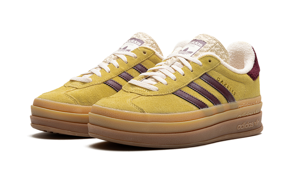 The Women’s adidas Gazelle Bold “Yellow/Burgundy” is a women’s-exclusive colorway of the retro shoe with a platform-style sole and other modifications. The contemporary-looking adidas Gazelle Bold features a triple-stacked, raised sole. As for the rest of the design, the shoe features a mustard yellow suede upper with burgundy leather Three Stripes on the sides. Gold “Gazelle” branding is seen on the lateral side of the shoe. The burgundy terry cloth heel tab matches the material used on the shoe’s inner lining. A stacked gum rubber sole completes the look.