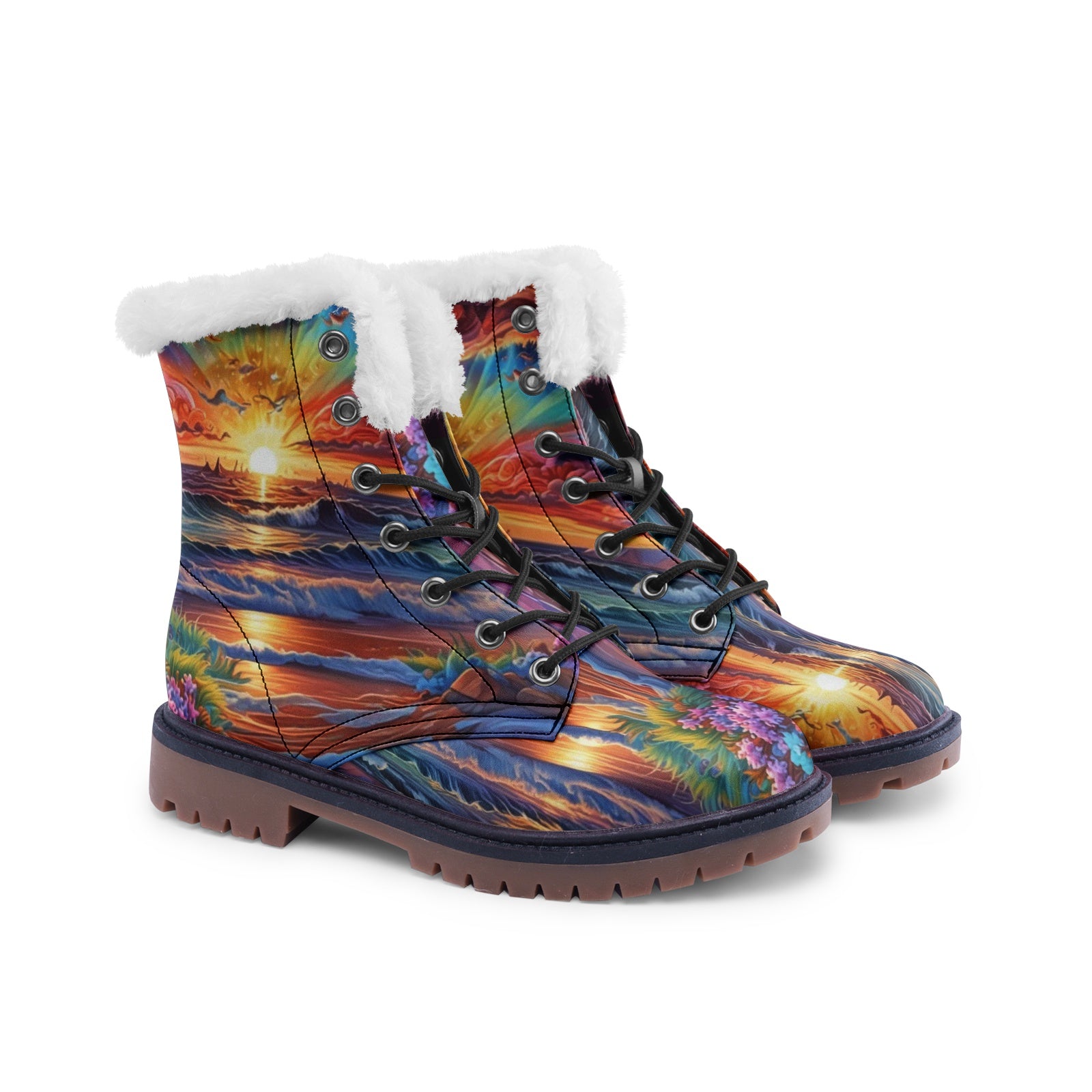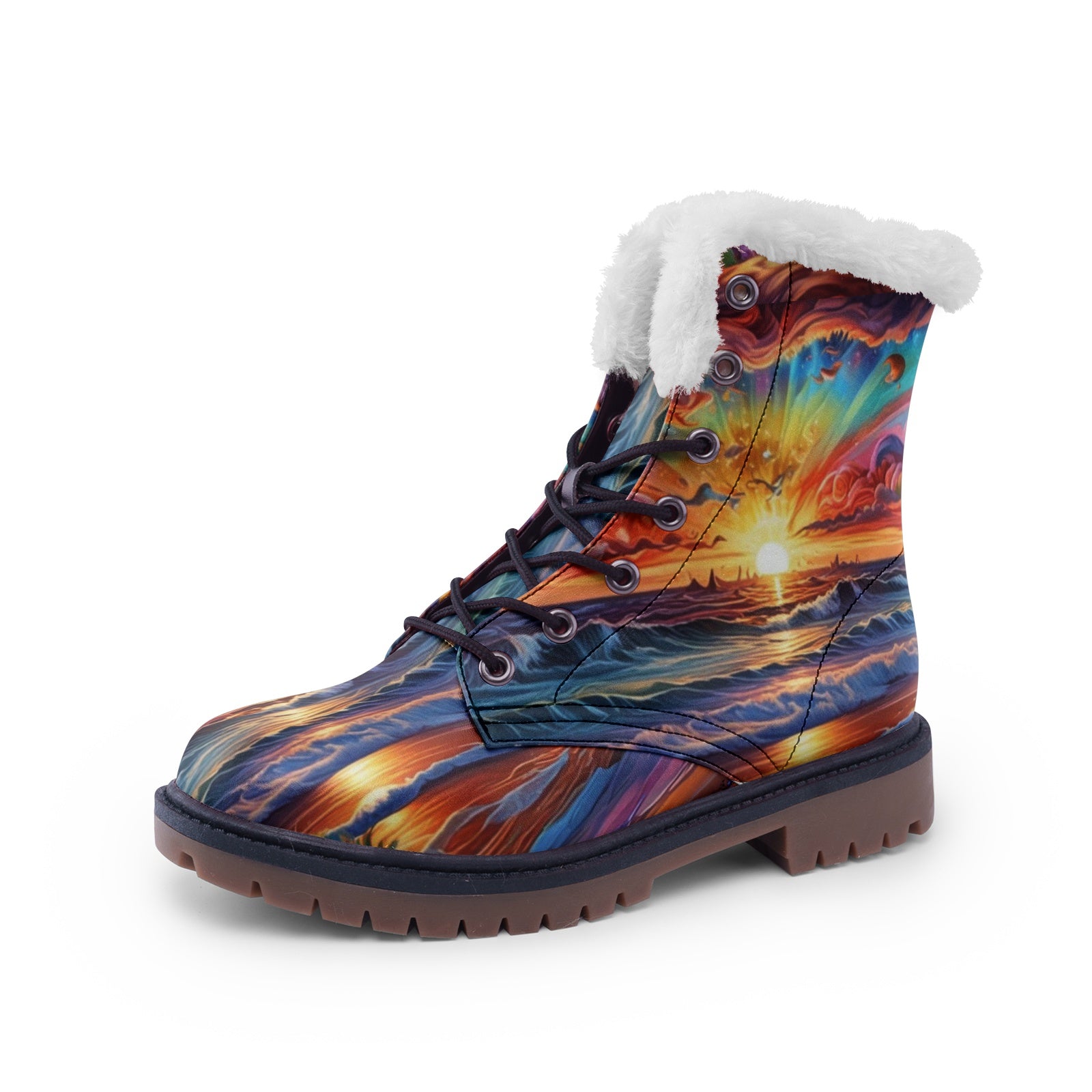 Step into the serene beauty of the sunset with these colorful faux fur beach boots. Designed for the free spirit, these boots feature a vibrant image of a beach sunset, combining warm and vibrant colors for an eye-catching look. The faux fur lining is both stylish and comfortable, making them perfect for all-day wear. Ideal for hippies and those who love colorful, nature-inspired designs, these boots bring a beachy feel to your everyday outfits.