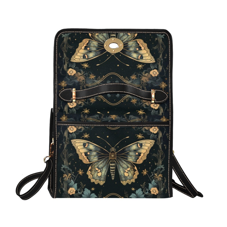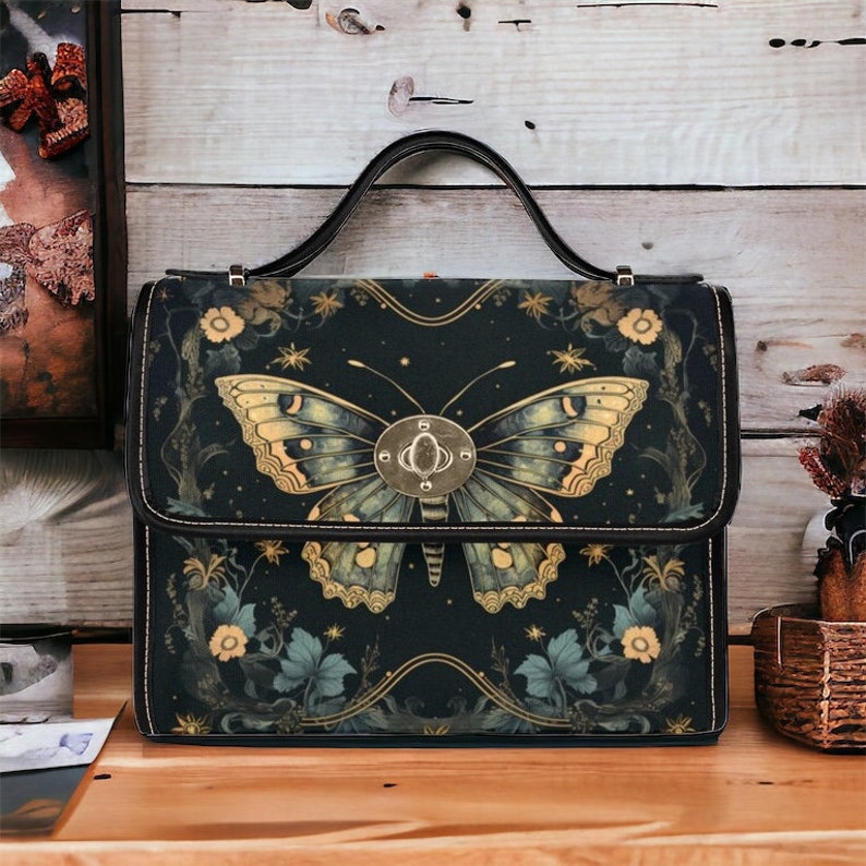 Introducing our Moth Handbag, a unique accessory that captures the mystical allure of a dark aesthetic. Adorned with intricate moth motifs on a backdrop that captures the essence of whimsical fashion, this handbag blends elegance and obscurity. Crafted from durable materials, it combines practicality with artistic flair, perfect for carrying essentials with a touch of mystical charm. Ideal for those who appreciate unique and atmospheric fashion, looking for accessories that reflect their love of whimsical prints and darkly elegant style.