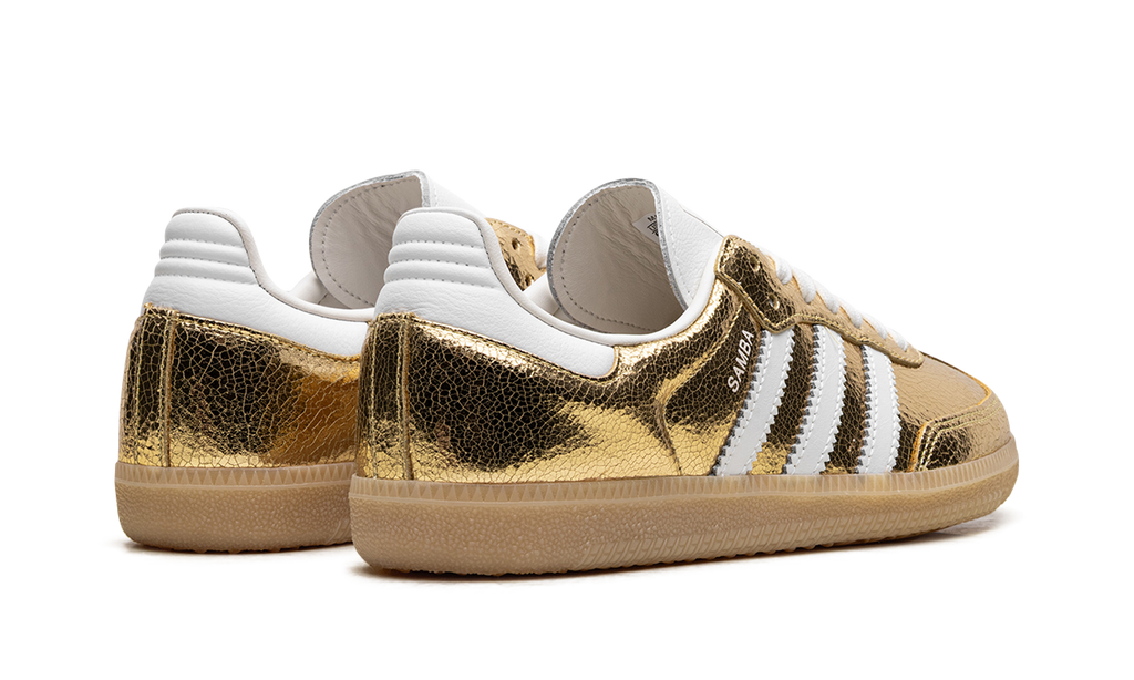 Step into a striking, modern aesthetic with the Adidas Samba OG Wmns "Cracked Metallic Pack Gold". This celebrated women's sneaker features a bold, cracked gold upper complemented by sleek black accents and a classic gum sole. Enjoy superior cushioning and a design that’s perfect for making a stylish statement with a subtle pop of metallic.