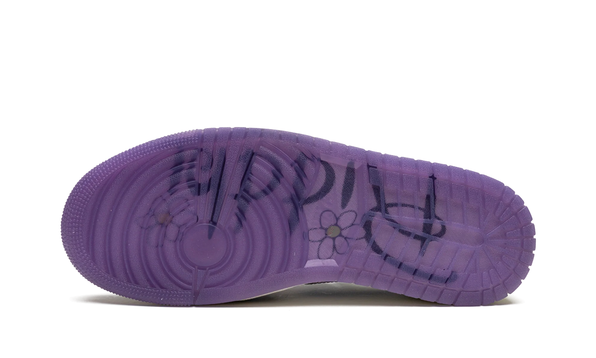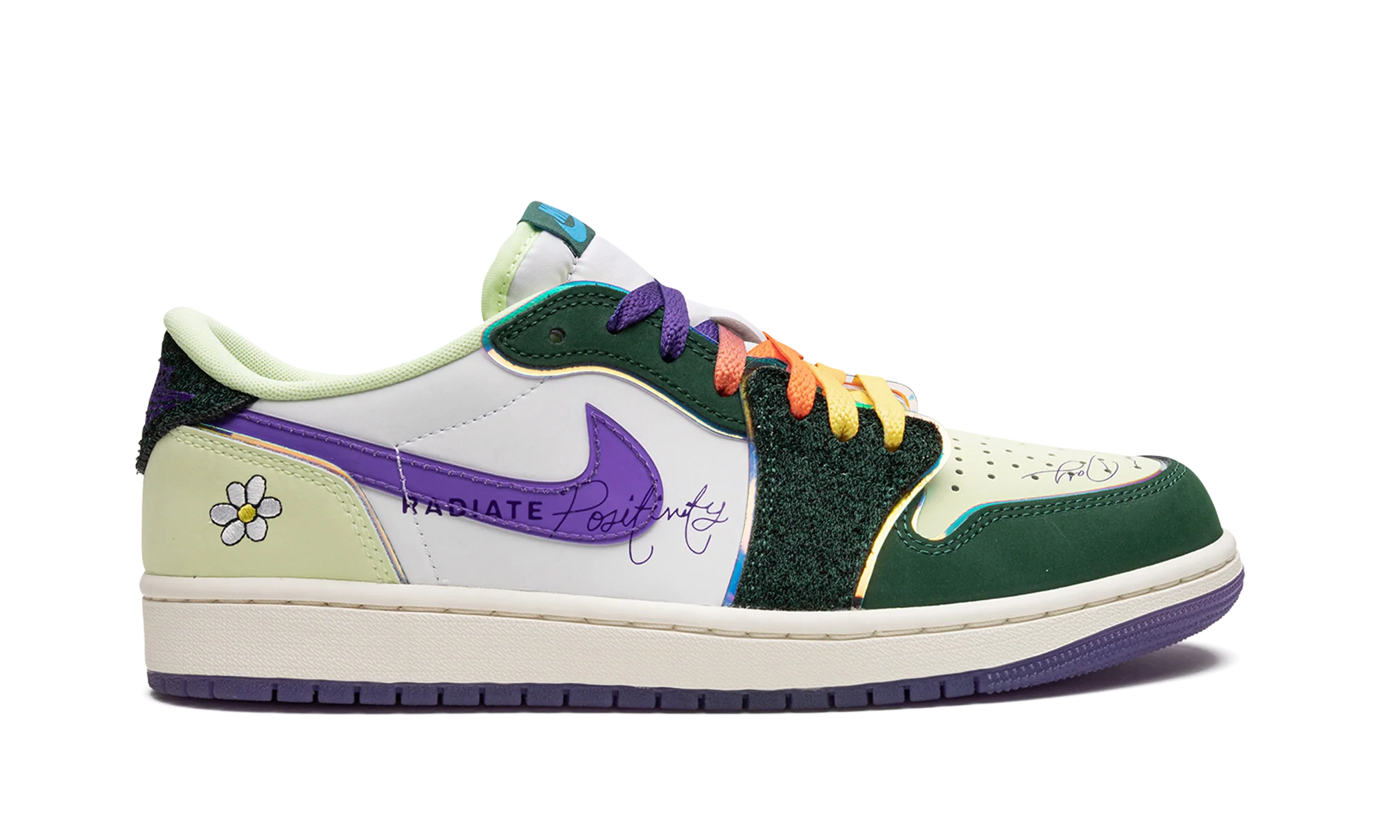 The Air Jordan 1 Low OG “Doernbecher” is a special colorway of the classic basketball shoe from Nike’s Doernbecher Freestyle collaboration with the Doernbecher Children’s Hospital of Portland, Oregon. Designed by patient Raddihi Mahajan, this creative look for the Jordan 1 Low OG features an eye-catching color scheme with unique branding elements. Specifically, the shoe has a Barely Volt perforated leather toe and heel. Hairy Gorge Green suede is found on the forefoot and on the leather toe cap and upper eyelet panel. Court Purple leather Swoosh branding appears on the sides. Raddihi adds her signature touches to the shoe with her own branding on toe, mid-panel, tongue, and insole.