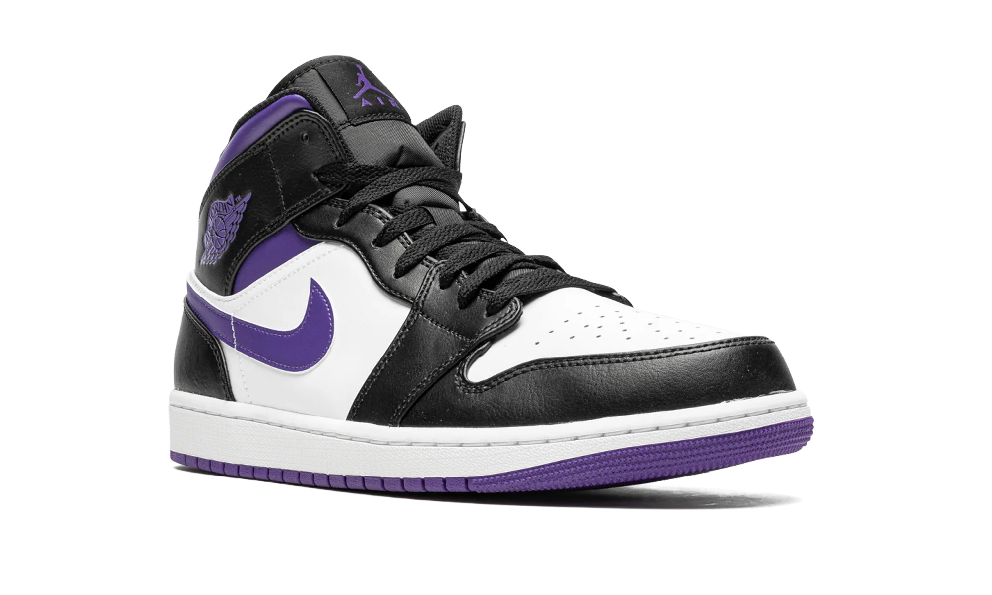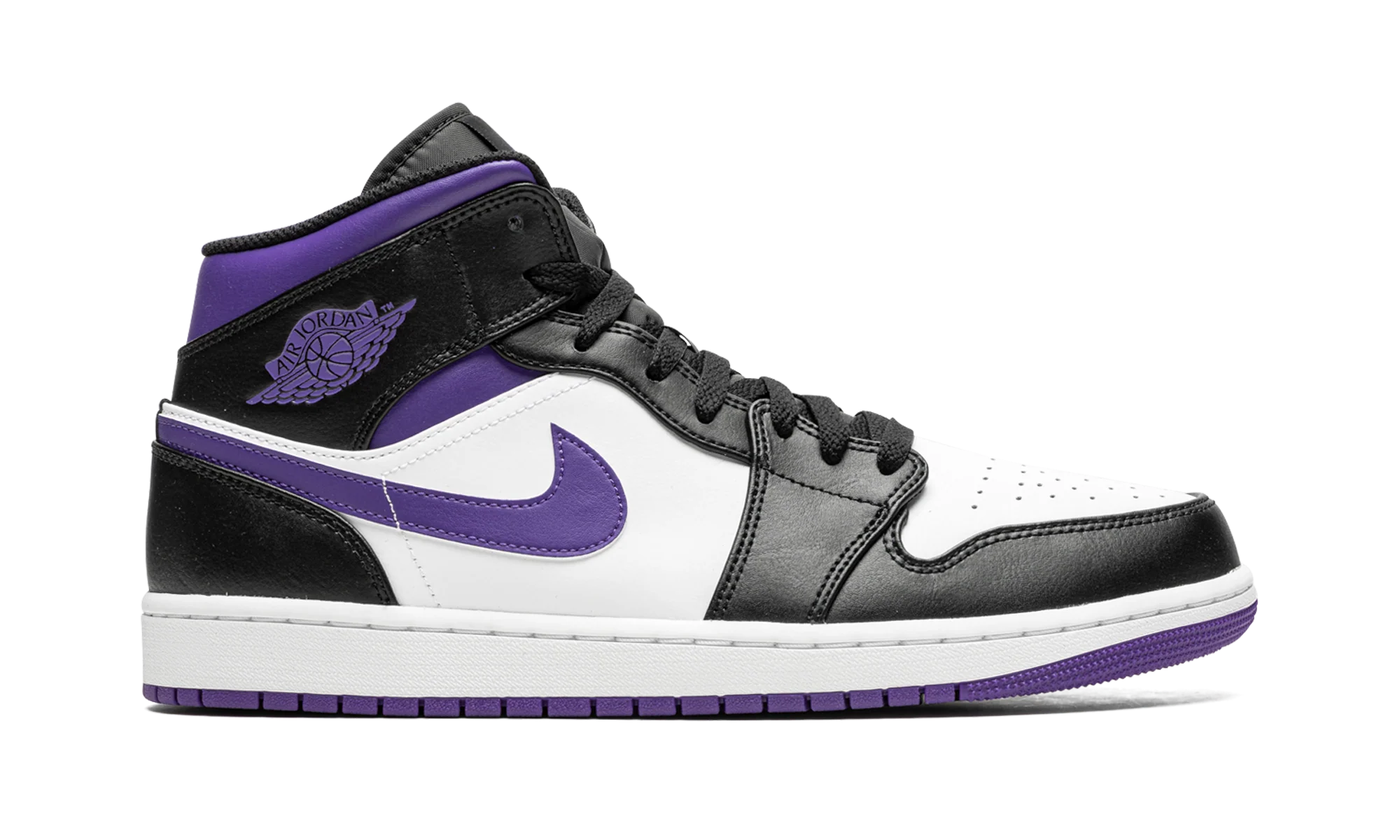 The Air Jordan 1 Mid “Dark Iris” is a colorway of the mid-top version of Michael Jordan’s first signature shoe that unofficially shows love to the Sacramento Kings. Dressed in the basketball team’s black, white, and purple team uniform colors, the “Dark Iris” is in no way affiliated with the Kings, but brings to mind all of the great Player Exclusive Air Jordan colorways worn by former Kings players and Team Jordan members Mike Bibby and Mitch Richmond. The shoe features a white perforated leather toe and mid-panel. Contrasting black leather overlays appear on the forefoot, eyelets, collar, and heel. A Dark Iris leather Swoosh is found on the sides. The purple hue also appears on the “Wings” logo, on the collar, and on the Jumpman and “Air” branding on the tongue tag.