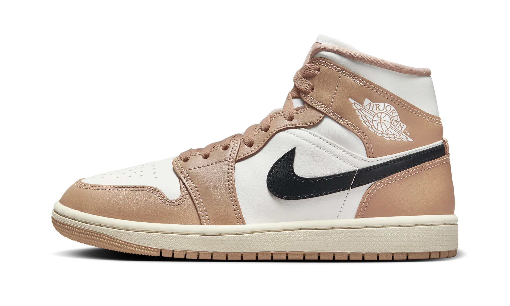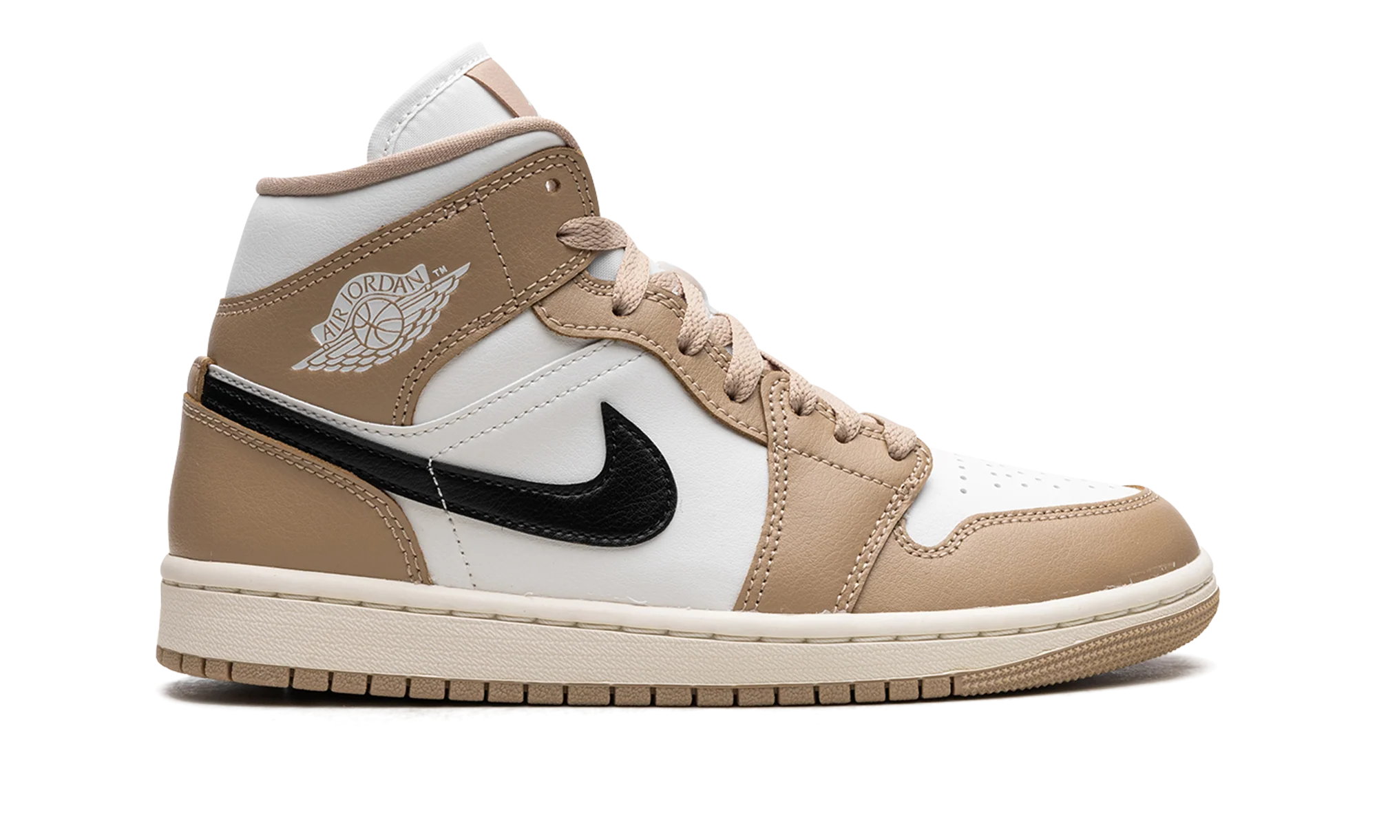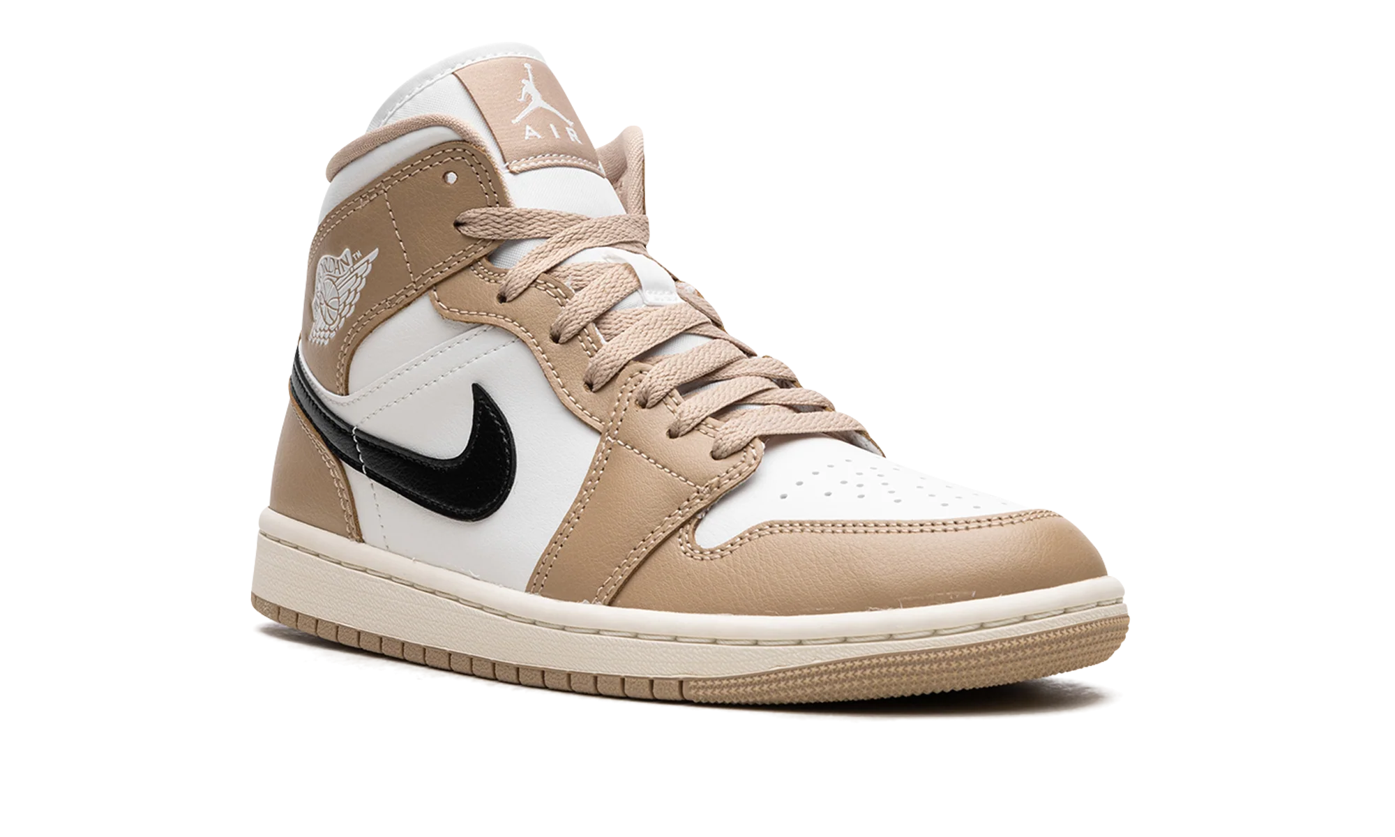 The Women’s Air Jordan 1 Mid "Desert" is a women’s-exclusive colorway of the casual sneaker with a versatile, earth-toned color palette. The upper features a Sail leather base that’s contrasted with Desert, or tan, leather overlay panels on the toe cap, forefoot, eyelets, collar, and heel. A black leather Swoosh can be seen on each side. More classic Air Jordan branding appears on the shoe, with a “Wings” logo residing on the collar and a Jumpman logo dotting the tongue. A cream-colored rubber midsole and tan rubber outsole complete the look.