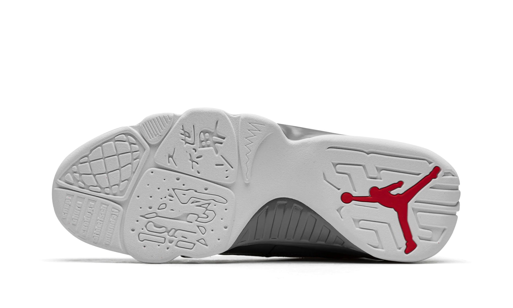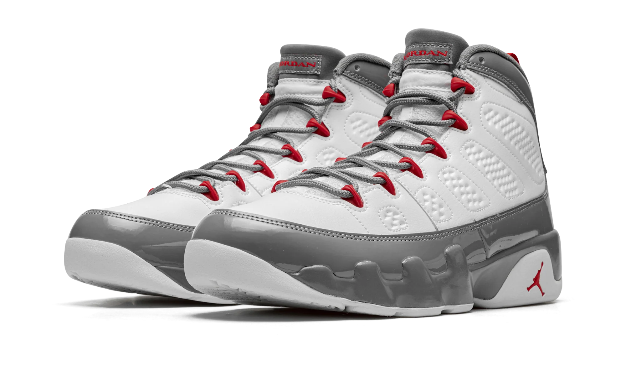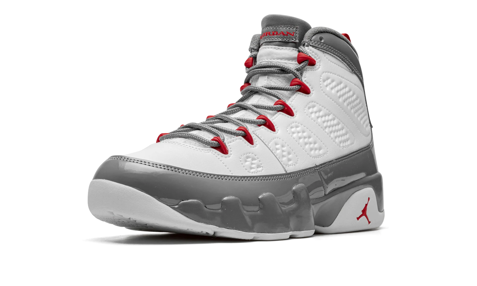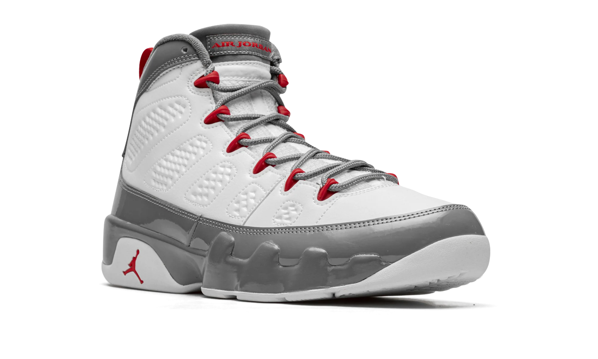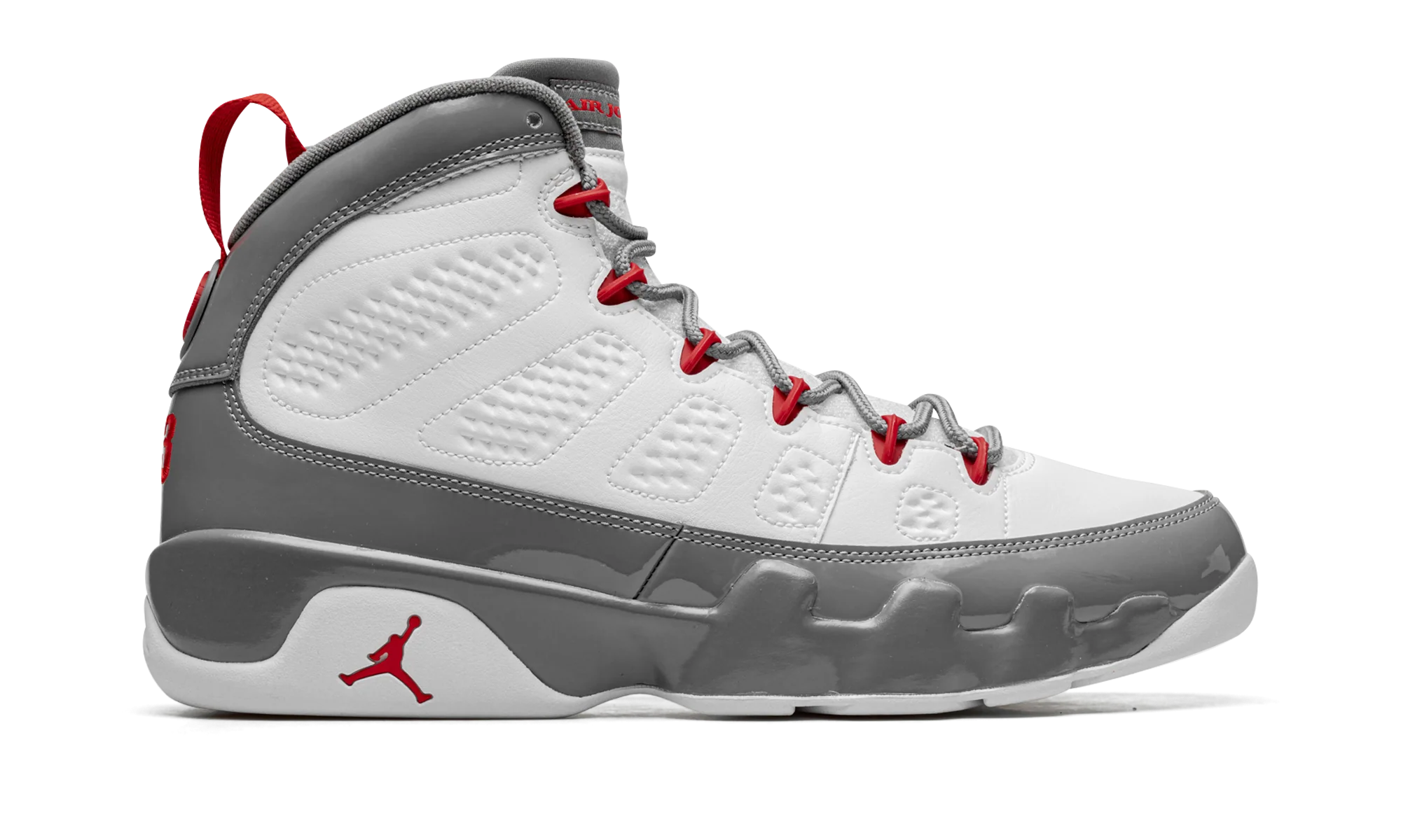 The Air Jordan 9 “Fire Red” is a colorway of Michael Jordan’s ninth signature shoe that is loosely inspired by the Chicago Bulls. As with other classic and popular Air Jordans in “Fire Red” colorway, this Jordan 9 features a fiery shade of red that is found on the Bulls’ team uniforms. The shoe features a white leather construction with a contrasting grey patent leather mudguard overlay that extends from the toe up to the collar. Fire Red accents are found on the eyelet loops, on the pull tab on the heel, and on the “Jordan” branding on the tongue. A Fire Red Jumpman also appears on the lateral side of the white foam midsole.