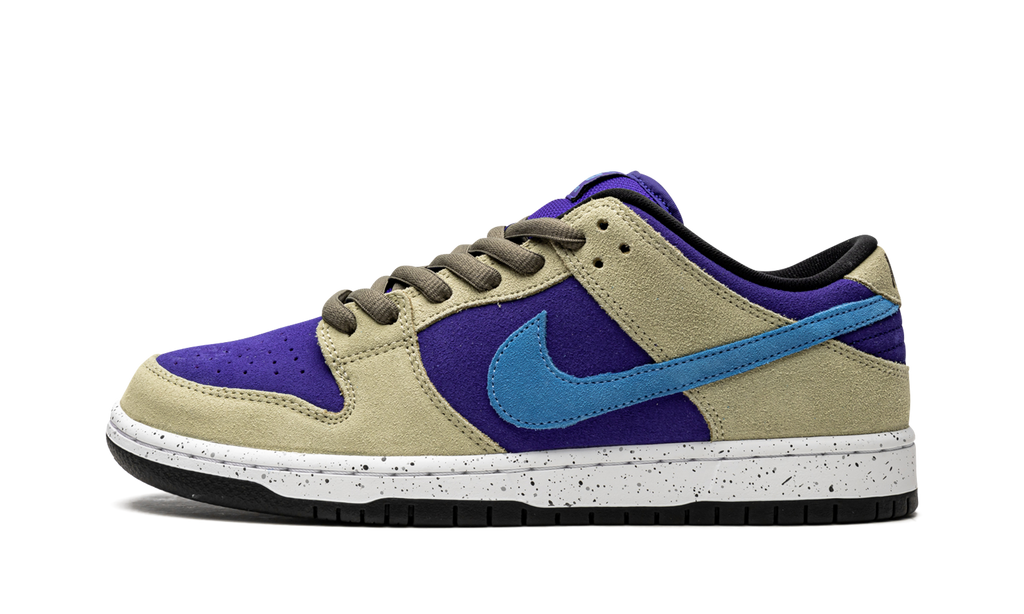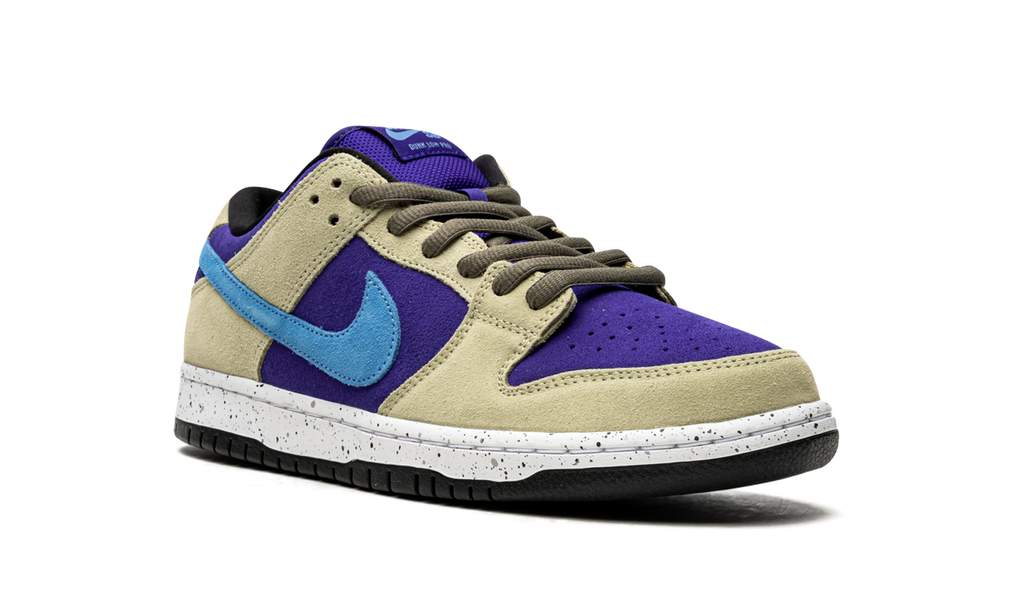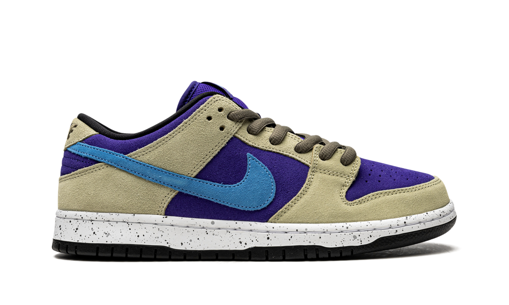 The Nike SB Dunk Low “ACG - Celadon” is a outdoors-inspired colorway of the low-top skate shoe that honors Nike’s ACG Terra silhouette that debuted in the early ‘90s. The “Celadon’s” throwback color block of purple, beige, and blue mimics the exact styling of the Nike ACG Terra of the same nickname. Purple suede forms the base of the shoe and appears on the perforated toe, mid-panel, collar, and heel. Beige suede can be found on the forefoot, eyelets, collar, and heel overlays. Nike constructs the suede Swoosh branding on both sides of the shoe in an attention-grabbing blue hue à la the Swoosh logo found on the ACG Terra “Celadon.” Dark beige “Nike” embroidery is stitched onto the heel and blue “Nike SB” and “Dunk Low Pro” insignia appear on the purple nylon tongue tag stitched onto the puffy purple mesh tongue. Dark tan laces and a white rubber midsole with black speckling complete the look of this rugged colorway inspired by Nike’s old school ACG performance footwear.