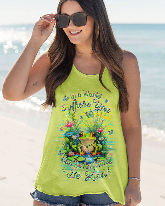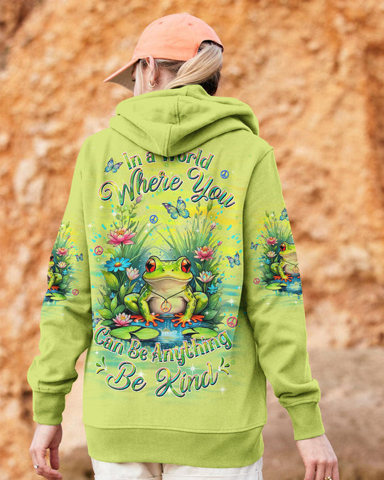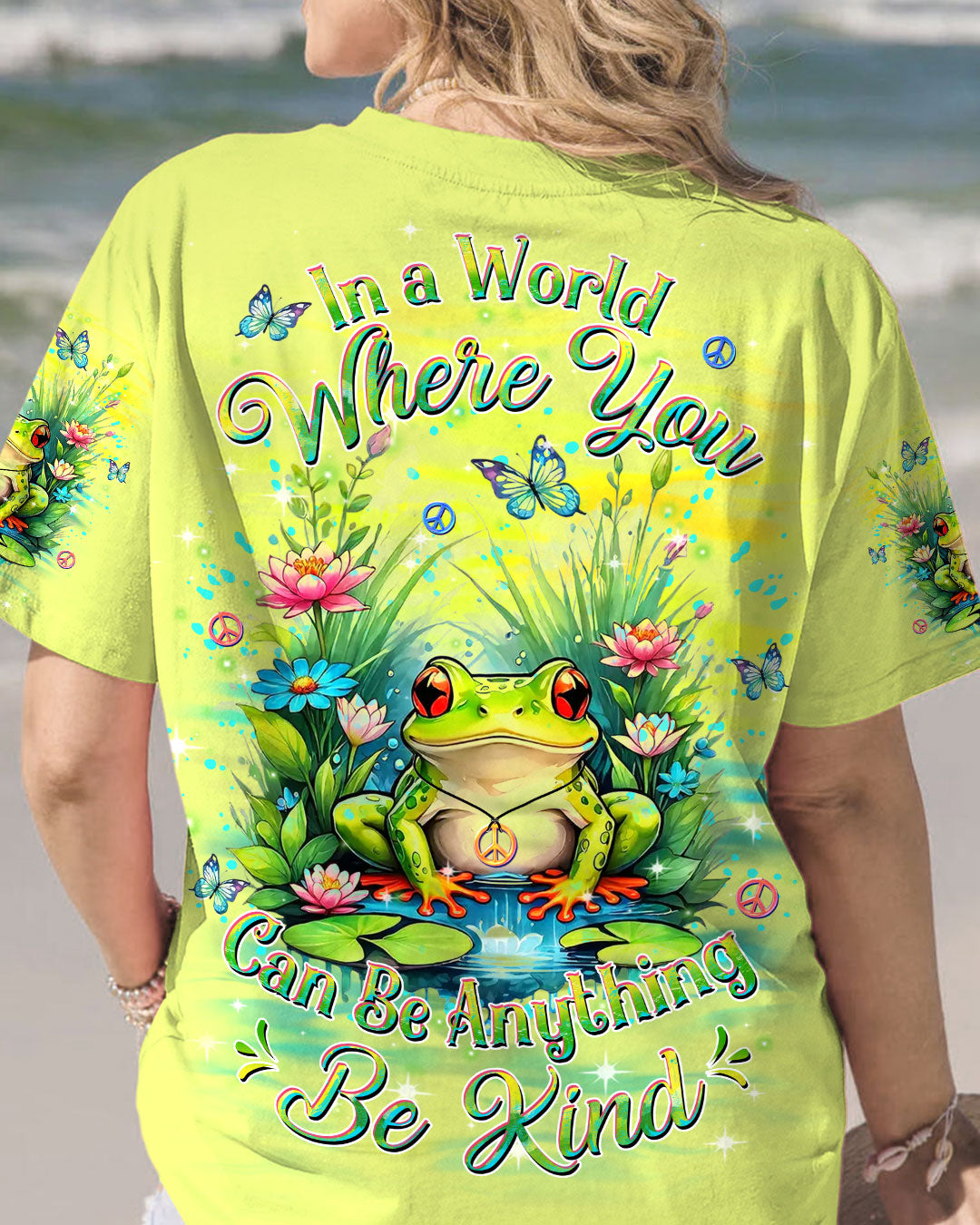 "Be Kind" Frog All Over Print t-shirt represents a joyful and compassionate spirit. Decorated all over with a fun frog motif, this shirt exudes positivity. Crafted for comfort and detail with a captivating design, it's perfect for those who value kindness in their fashion. Capture the joyful charm of nature with this unique and expressive piece.