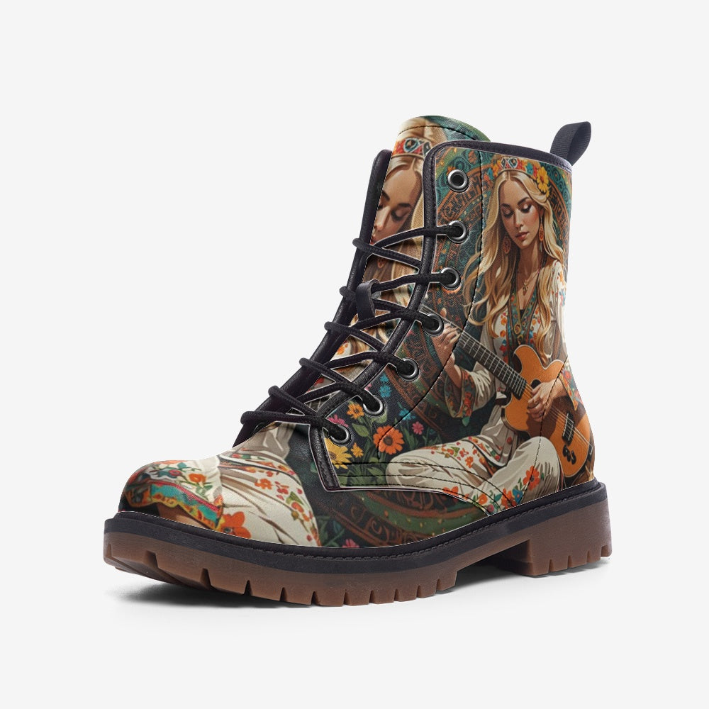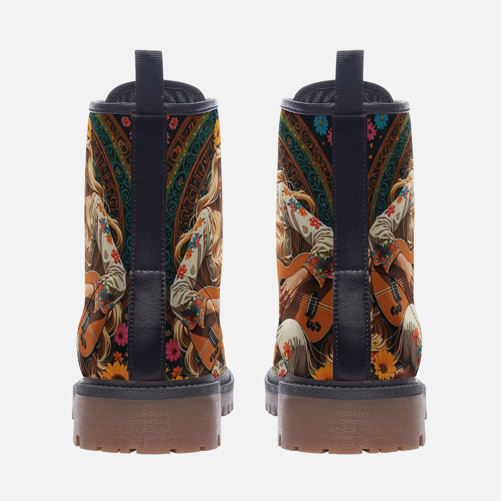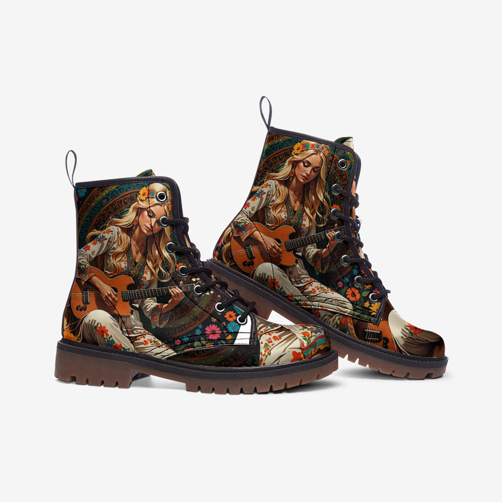 Strike a chord with the Emerald Blossoms - Blonde Guitarist boots. Showcasing a bohemian woman with blonde hair playing guitar, these casual leather boots celebrate the rhythm of music and the free-spirited soul. Lightweight and crafted for comfort, they're ideal for hippies who live for the melodies of life and the joy of self-expression. Step into these boots and let your musical spirit guide your journey.