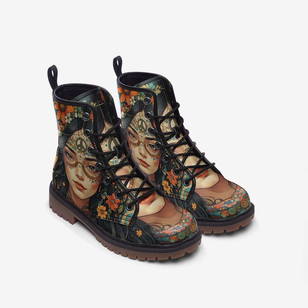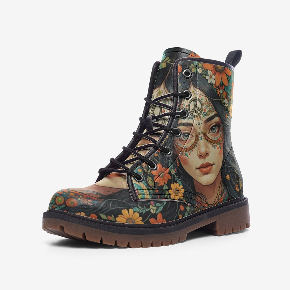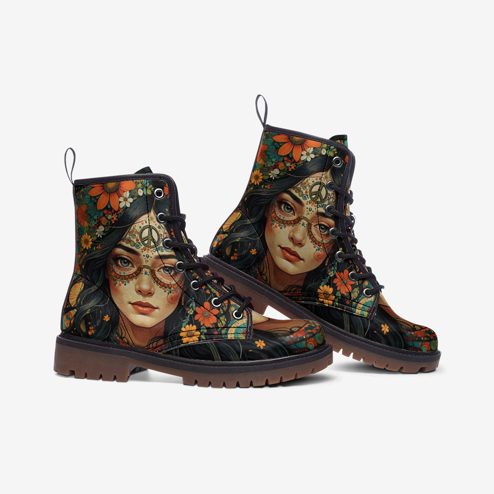 Upgrade your wardrobe with the Emerald Blossoms Casual Lightweight Leather Boots, featuring a unique Bohemian Girl design with a peace symbol. Perfect for the free-spirited and fashionable individual, these boots combine artistic style with everyday comfort. Crafted from premium quality lightweight leather, they offer exceptional durability and comfort for all-day wear. Embrace bohemian style and make a statement with these distinctive boots that celebrate serenity, individuality and relaxed style. Ideal for both casual outings and adventures. Explore our collection today and enter a world of vibrant, harmonious fashion.