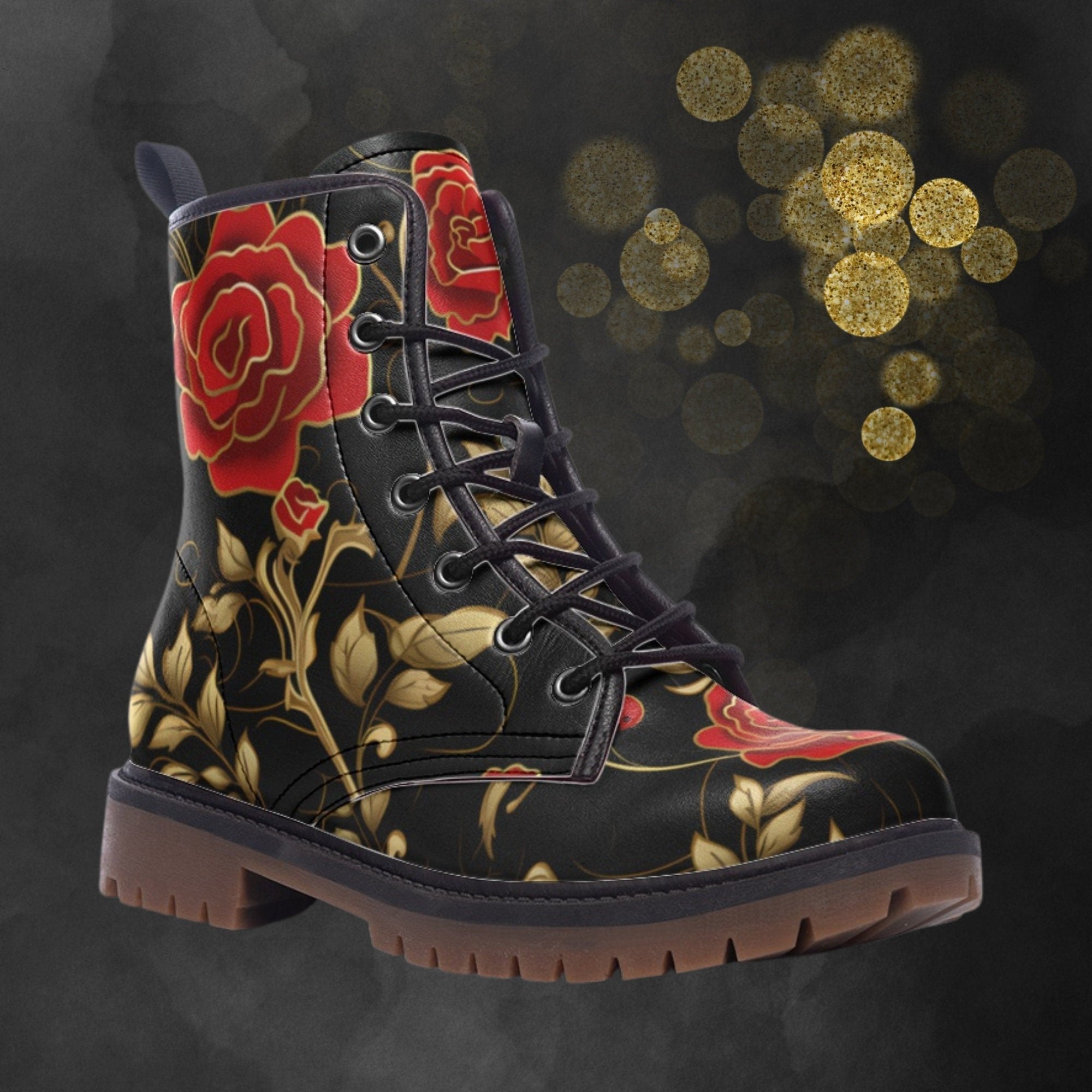 Introducing our Red Rose and Gold Leaf Painted Shoes, a fusion of natural beauty and artistic flair. Each pair is meticulously hand-painted on vegan leather, accented with red roses Brilliant and gold leafed. Perfect for those who appreciate unique style and ethical craftsmanship, these shoes offer both durability and botanical elegance Sophisticated with shoes that express creativity and dedicated fashion.