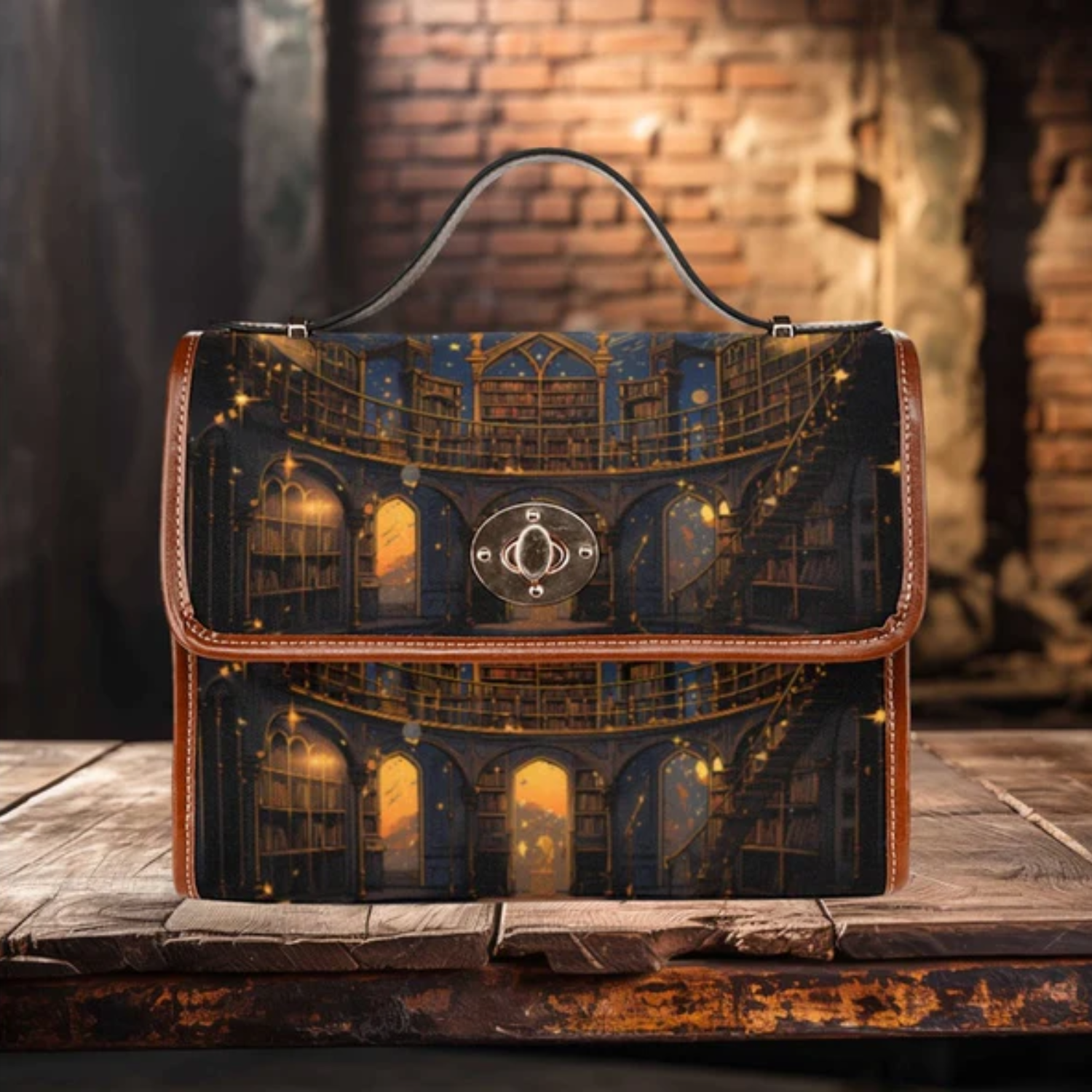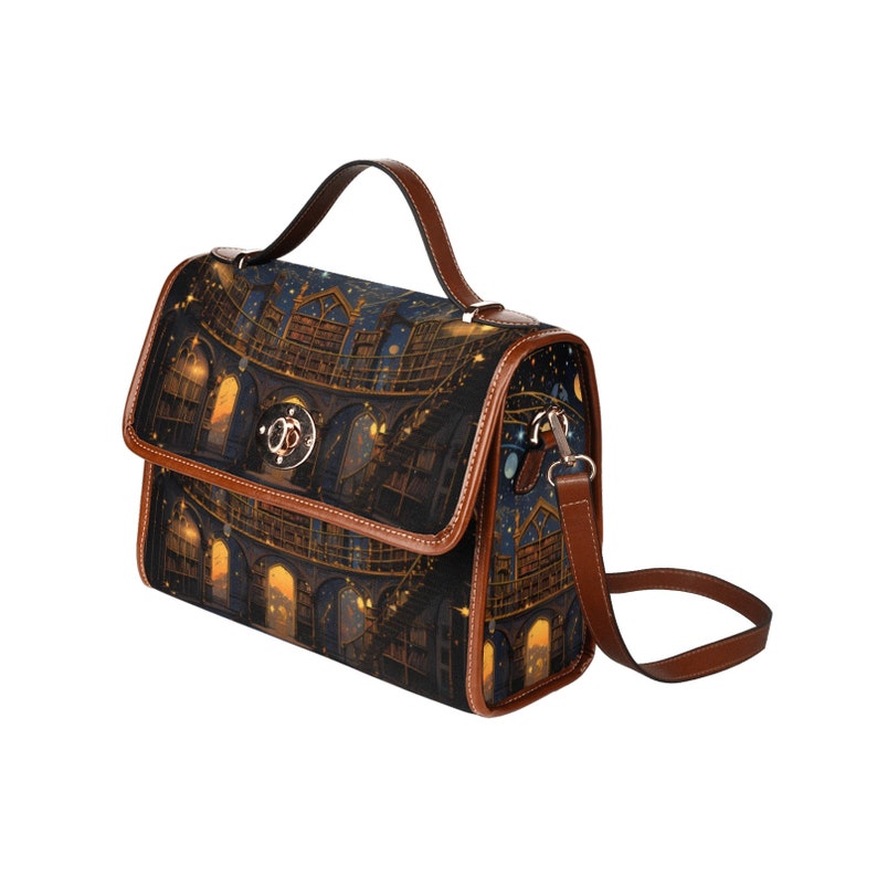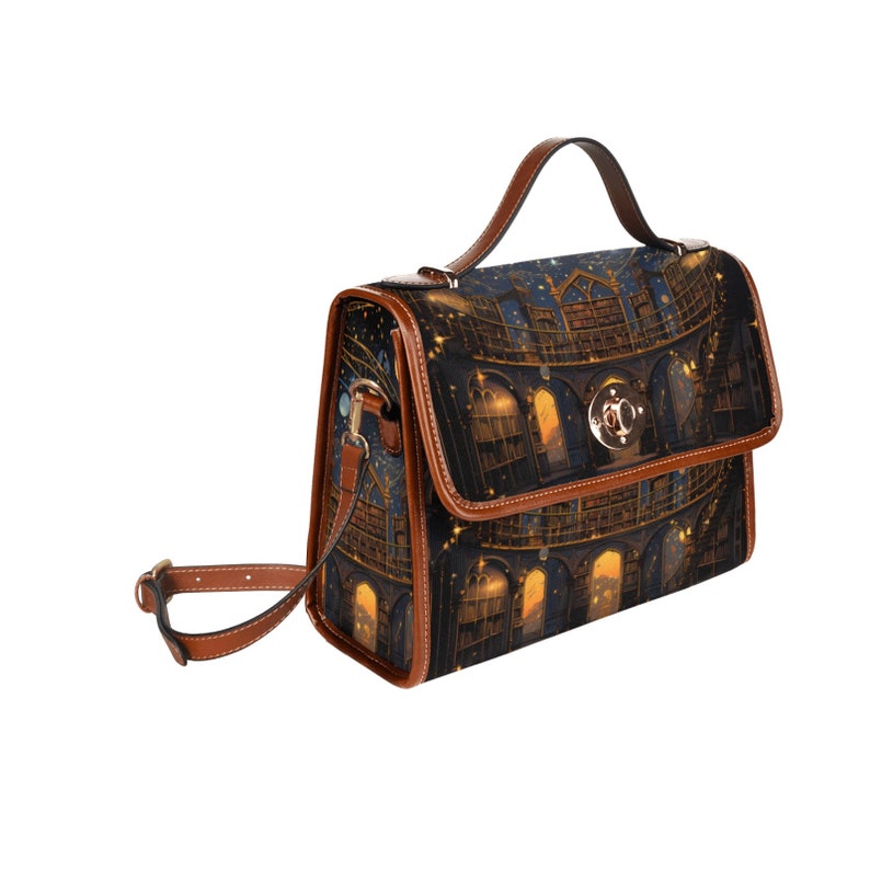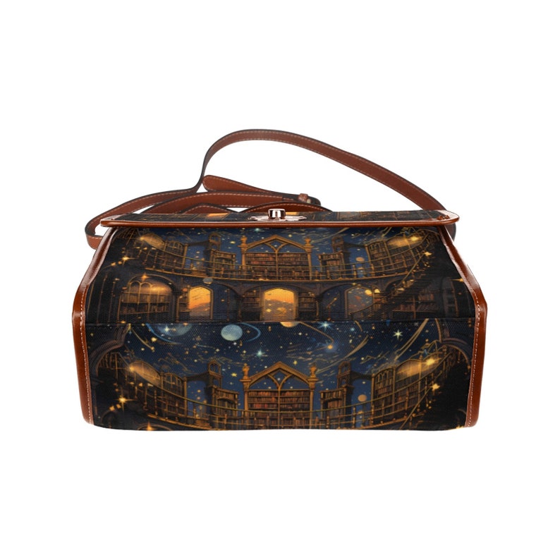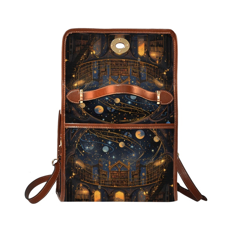 Introducing our Cosmic Gold Star Moon Old Library Satchel Bag, a unique combination of cosmic allure and old world charm. Adorned with intricate black and gold moon and star motifs against a backdrop inspired by an antique library aesthetic, this bag embodies the essence of mystical luxury and intellectual curiosity. . Crafted from durable materials, it combines practicality with artistic flair, perfect for storing essentials with a touch of indulgent sophistication. Ideal for lovers of celestial themes and the atmosphere of ancient libraries, looking for accessories that reflect their love of cosmic beauty and classically inspired motifs.