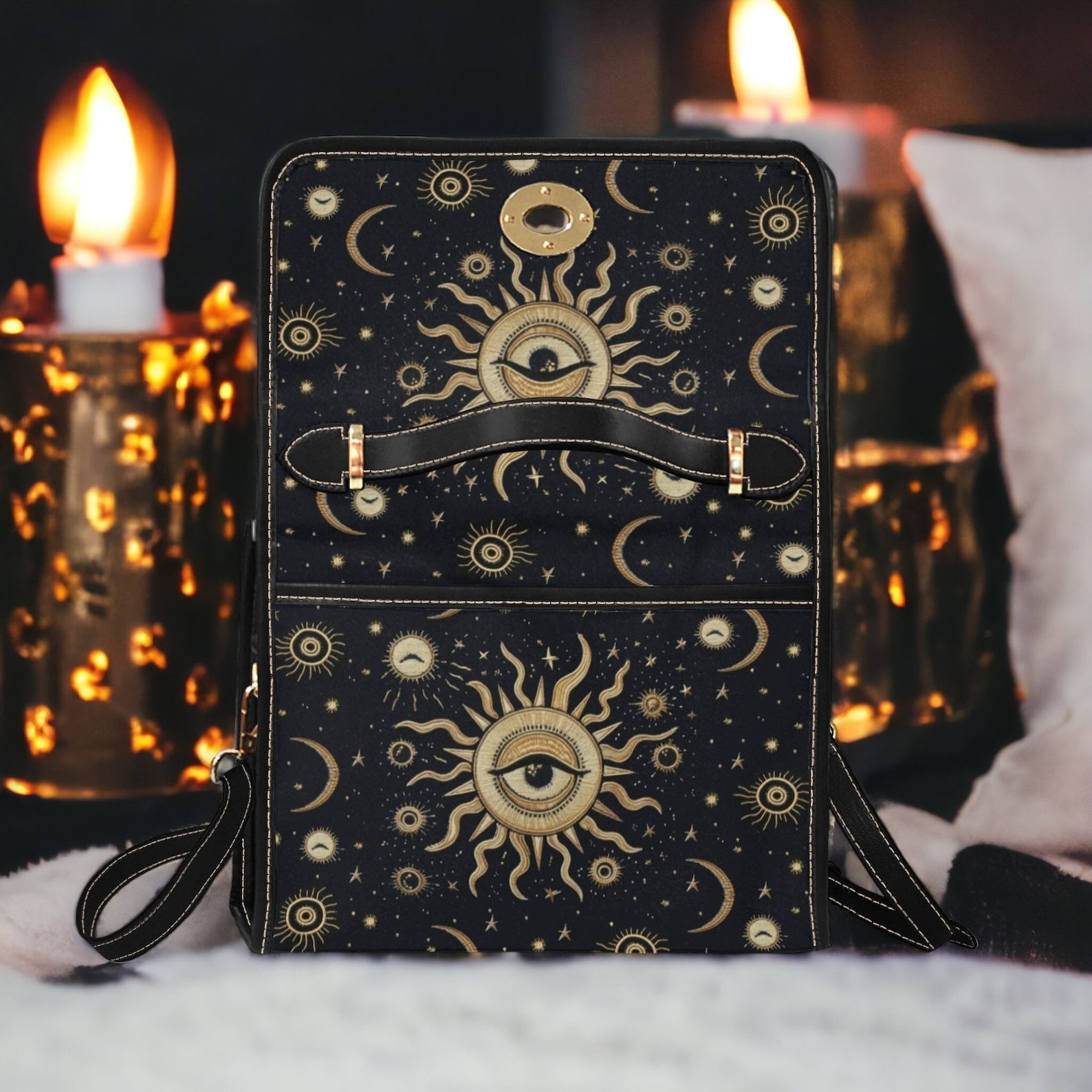 Introducing our Goth Chic Eye Sun Moon Stars Crossbody Wallet, a captivating combination of mystical elements and edgy style. Adorned with intricate motifs of eyes, suns, moons and stars, this crossbody purse embodies the essence of Gothic chic. Crafted with attention to detail, it combines practicality with artistic flair, perfect for carrying essentials with a bold and enchanting feel. Ideal for those who love the mystery of celestial themes and seek accessories that reflect their unique sense of dark beauty and cosmic passion.