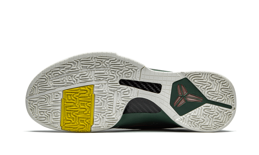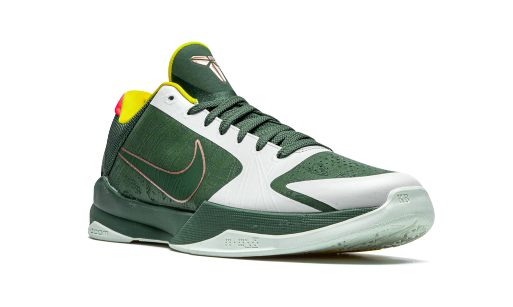 The Nike Kobe 5 Protro “EYBL” is a unique colorway of Kobe Bryant’s fifth signature shoe with Nike Basketball that is inspired by Greek mythology. A Summer 2020 release that coincided with Mamba Week, the “EYBL” design summons the energy of the mythical Medusa, who was known to stun her opponents unexpectedly. The upper of the shoe features Forest Green leather in a snakeskin like pattern on the perforated toe and mid-panel. Contrasting light grey overlays on the forefoot, toe, and eyelets break up the appearance. Tonal green mesh detailing is located on the padded ankle collar. A shiny green synthetic heel cup with Bryant’s signature in bronze adds to the appealing look of this colorway. Other details include hits of yellow and red on the liner and heel tab, respectively. Nike’s “EYBL” insignia appears on the green nylon tongue. A bronze Swoosh outline dots either side of the upper. Zoom Air cushioning technology is inside of the sole and provides the wearer with ample amounts of comfort whether on or off the court. Release date: August 29, 2020.