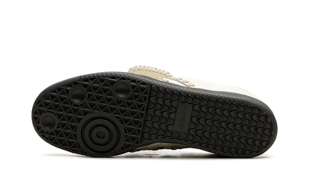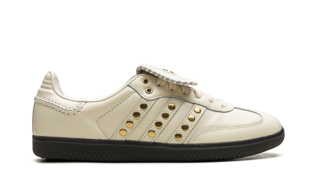 The Wales Bonner x adidas Samba "Studded Cream" is a collaboration by the talented fashion designer and adidas on a version of the retro shoe with metallic gold studs on its design. Grace Wales Bonner has played a key role in the resurgence of the adidas Samba, and with her “Studded Cream” colorway, continues her ultra successful collaborative history on the model. The “Studded Cream” features a Cream White leather construction with tonal leather overlays. The Three Stripes branding has metallic gold studs that give the shoe a decidedly high fashion-inspired look. Additional details include white stitching along the heel, a folded tongue, and a dark gum rubber sole.