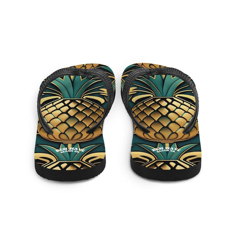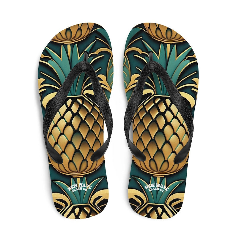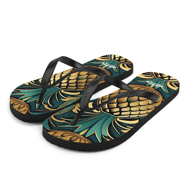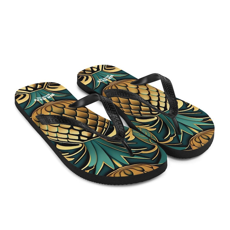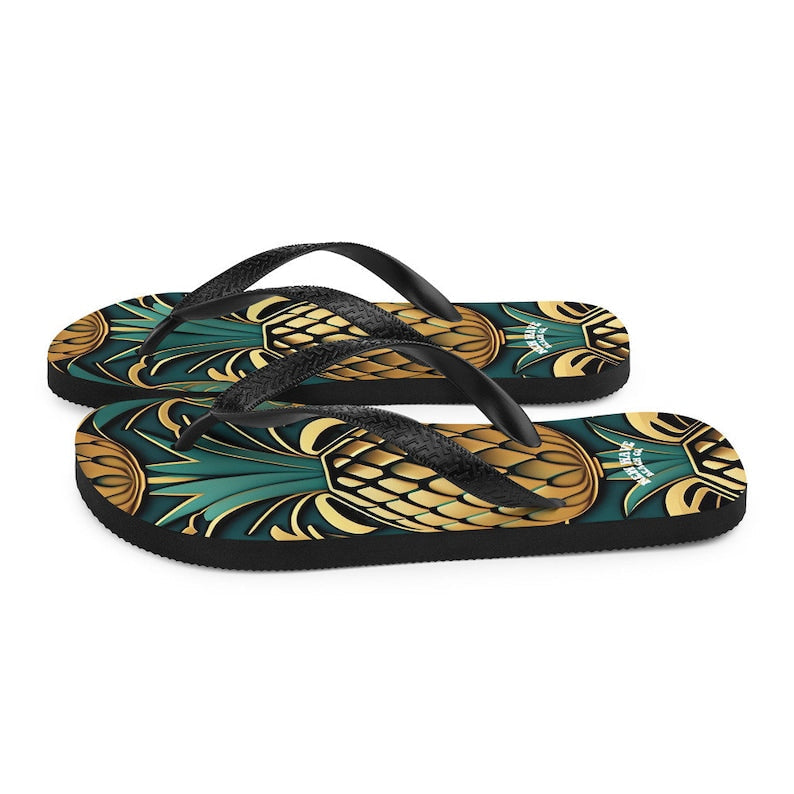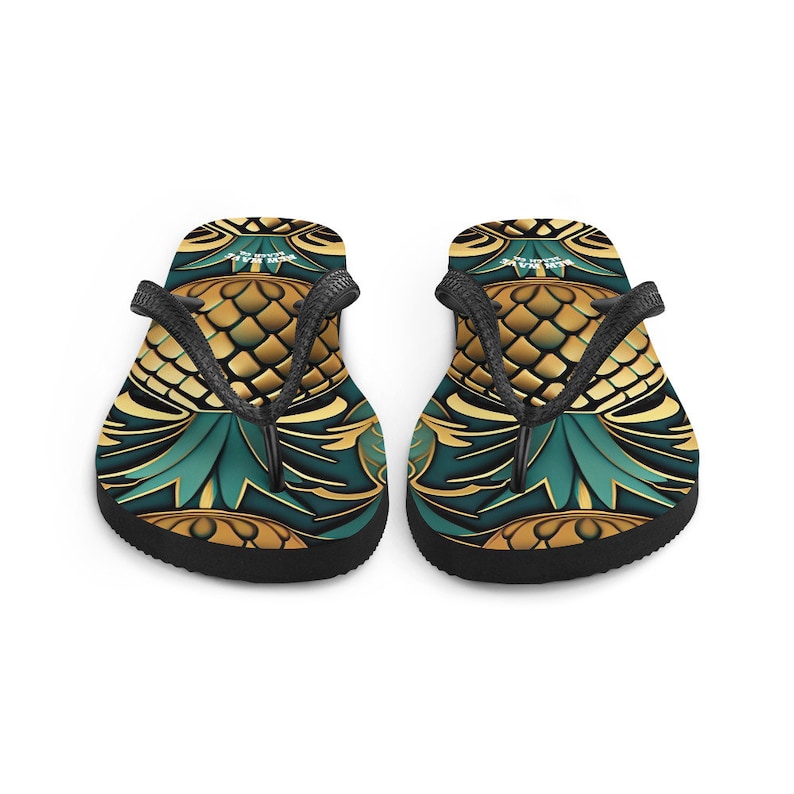 Jump into summer with Emerald Blossoms' Art Deco Pineapple flip-flops. With a playful combination of yellow, gold and green, these fun fruit-inspired flip-flops are a vibrant addition to your footwear collection. Perfect for those who appreciate bold, artistic designs, they bring a whimsical tropical feel to any outfit. Whether you're relaxing poolside or exploring the city streets, these colorful flip-flops ensure both style and comfort. Get into the spirit of summer with the Emerald Blossoms Art Deco Pineapple Flip-Flops, where fun meets fashion with every step.