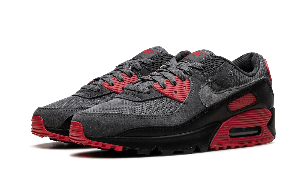 The Nike Air Max 90 is a celebrated icon, and this Black/Iron Grey/Fire Red (DM0029 007) colorway brings a bold, modern edge to its classic '90s running heritage. It combines deep, smoky neutrals with explosive pops of red for a look that's both stealthy and striking.