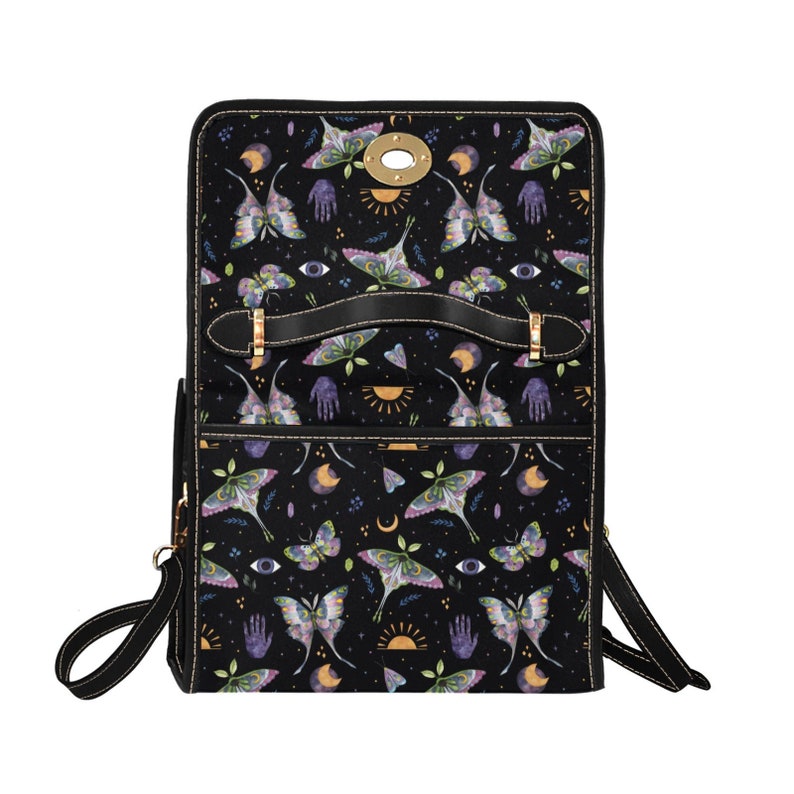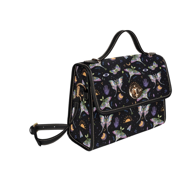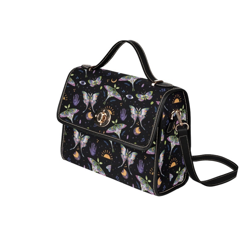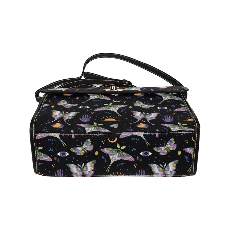 Introducing our Mystical Luna Moth Canvas Satchel Bag, a seductive and ethereal accessory that showcases the allure of the luna moth in mystical style. Adorned with intricate moth motifs against a serene canvas backdrop, this bag embodies the essence of mesmerizing luxury and natural beauty. Crafted from durable materials, it combines practicality with artistic flair, perfect for carrying essentials with a mystical charm. Ideal for those who appreciate the symbolic and aesthetic beauty of moths, looking for accessories that reflect their love of mystical and nature-inspired motifs.