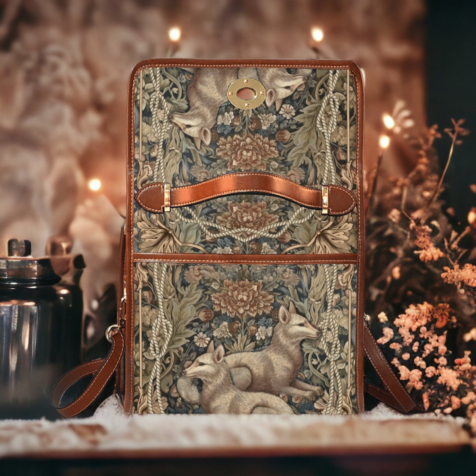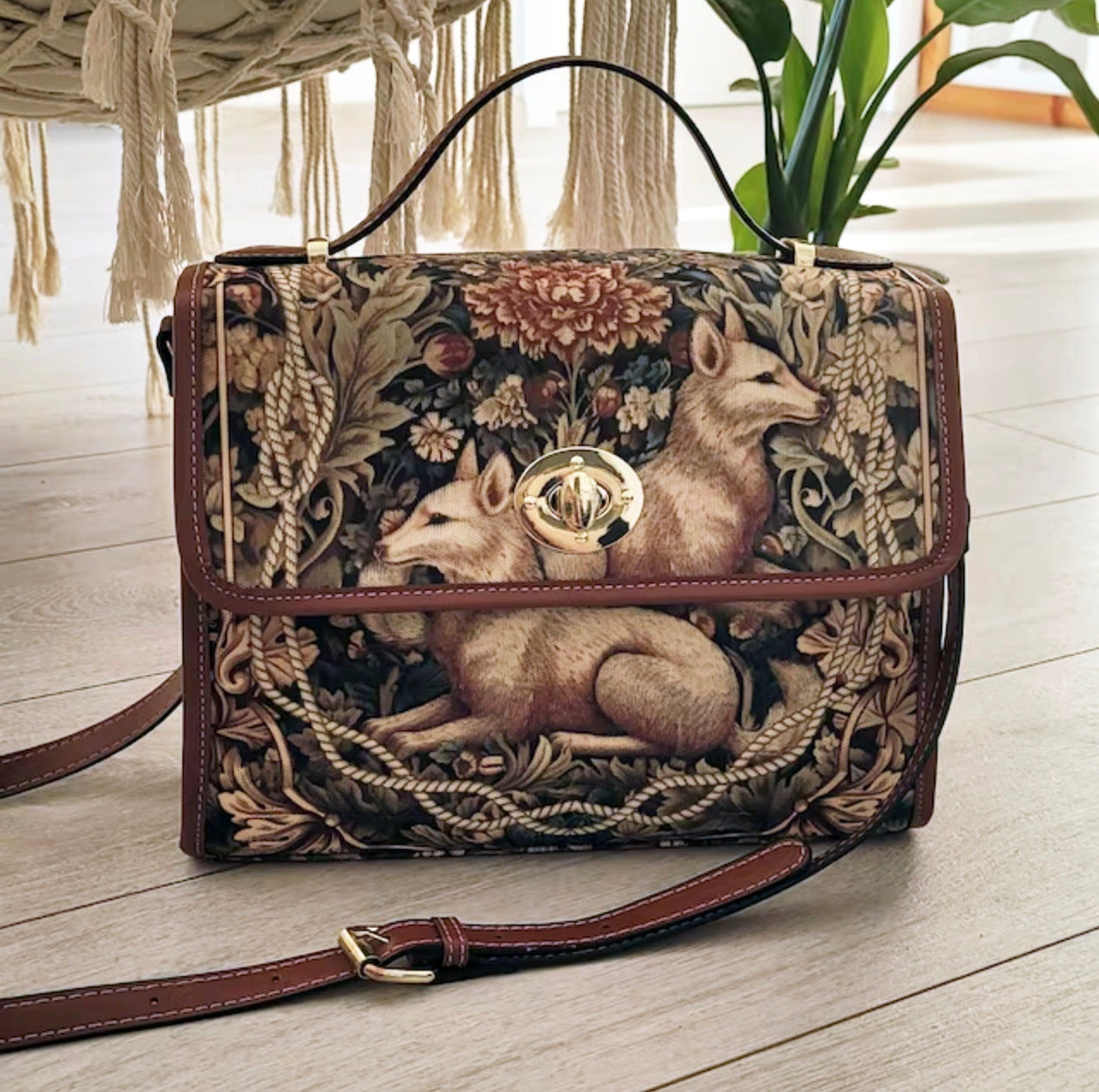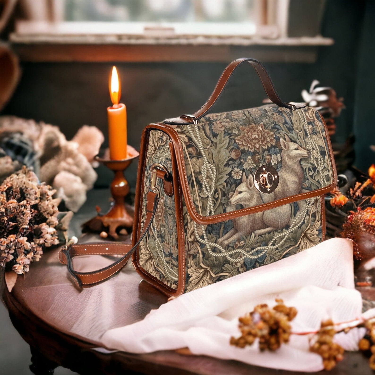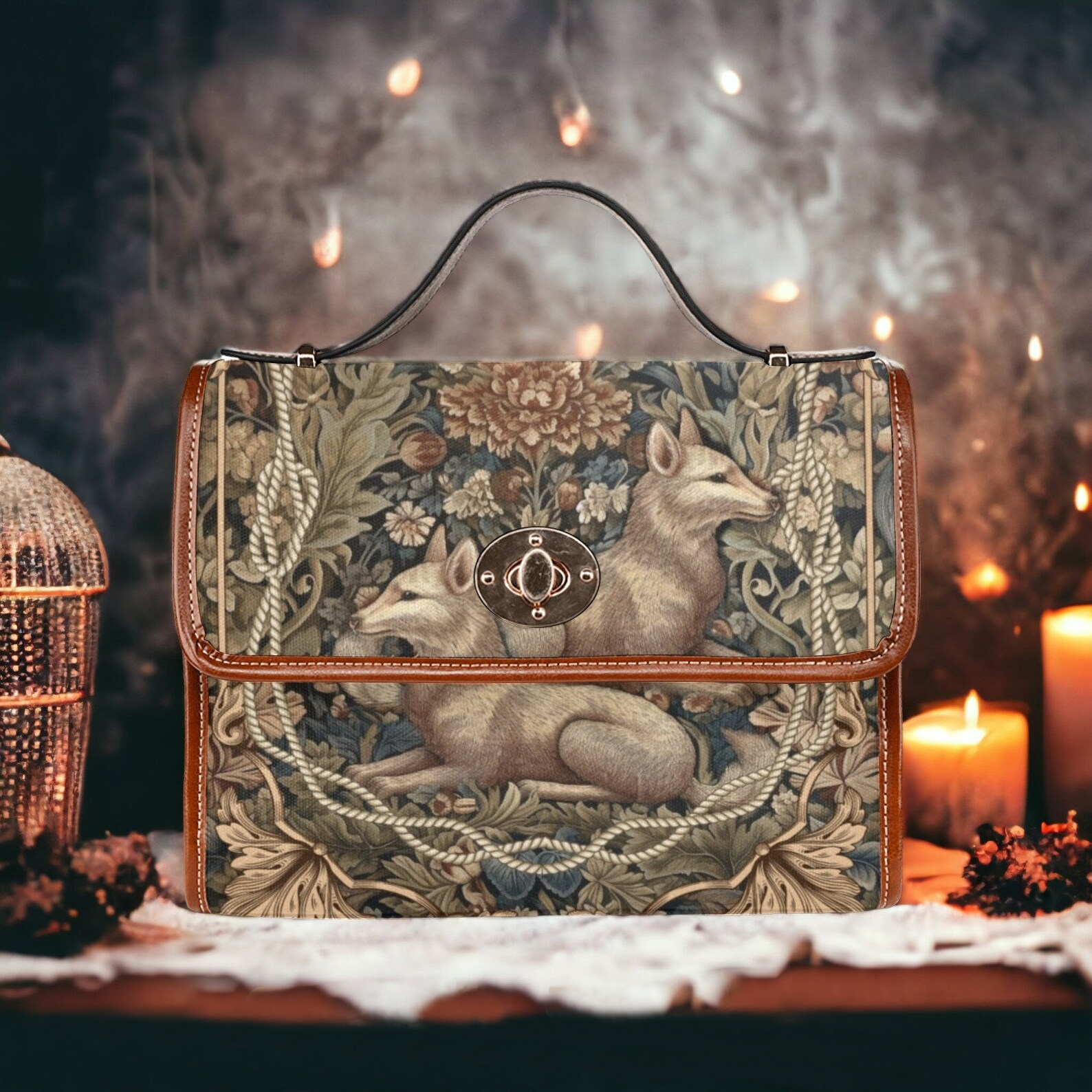 Introducing our Fox In The Forest Retro Satchel Bag, a whimsical take on the classic charm and allure of nature. Featuring an interesting design of a fox amidst a peaceful forest setting, this bag evokes a sense of nostalgia and rustic beauty. Crafted from durable canvas, it combines practicality with artistic flair, perfect for storing essentials with a touch of woodland elegance. Ideal for those who love the outdoors and seek accessories that reflect their love of wildlife and classic aesthetics.