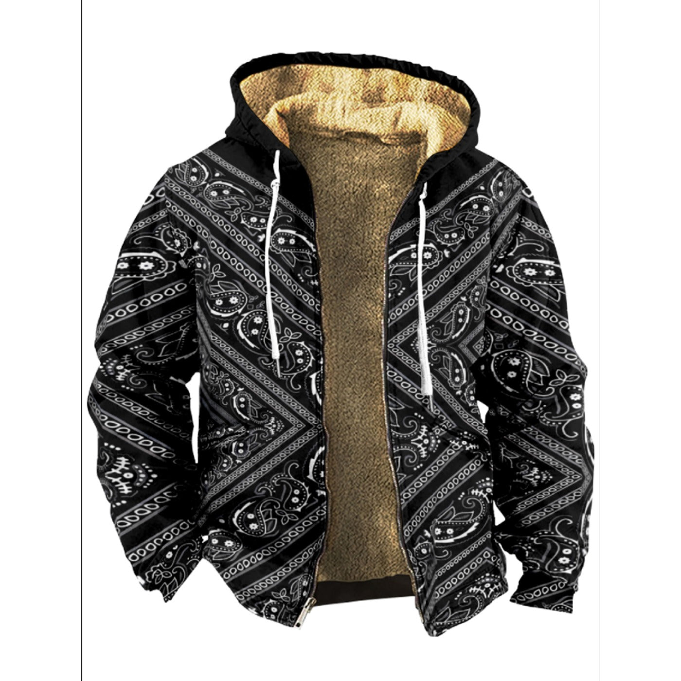 Emerald Blossoms - Western Aztec, Black Bandana Pattern Print Wool Hooded Jackets For Hippie