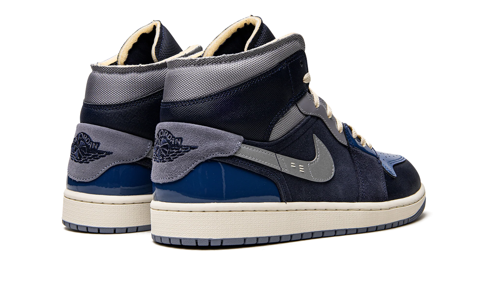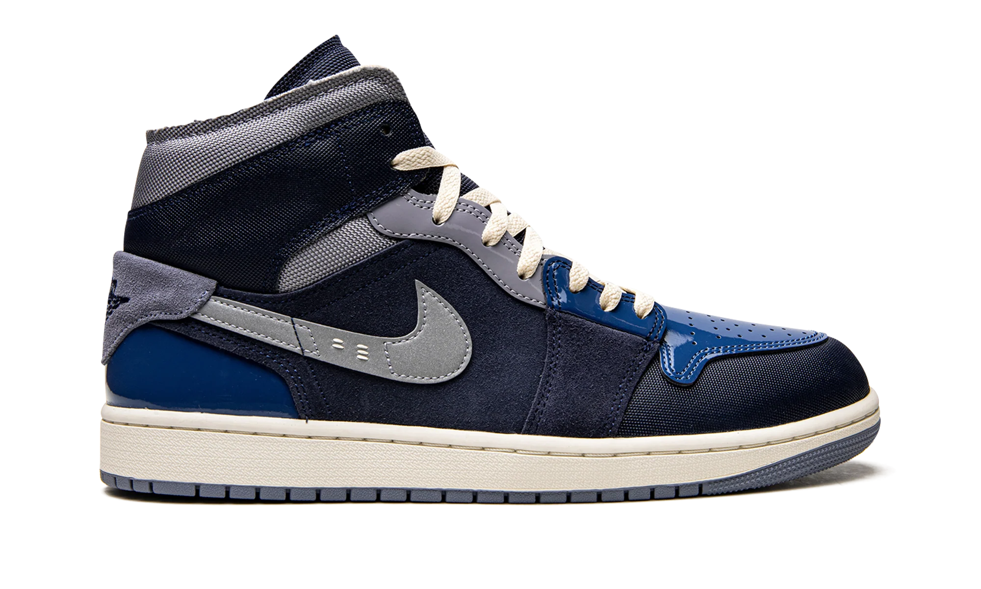 The Air Jordan 1 Mid SE Craft” Obsidian” is an alternate version of the lifestyle shoe that updates its design with an “inside-out” spin. The “Obsidian” gives the Jordan 1 Mid Craft a unique look with mismatched panels in various textiles. Blue-colored patent leather can be found on the perforated toe and lower eyelet while Obsidian suede appears on forefoot and mid-panel. The blue hue also graces the toe cap and heel. A grey Swoosh is found on the sides. An overlay panel with “Wings” branding is located on the back of the shoe, moved from its placement on the collar on the Air Jordan 1 Mid’s original design.