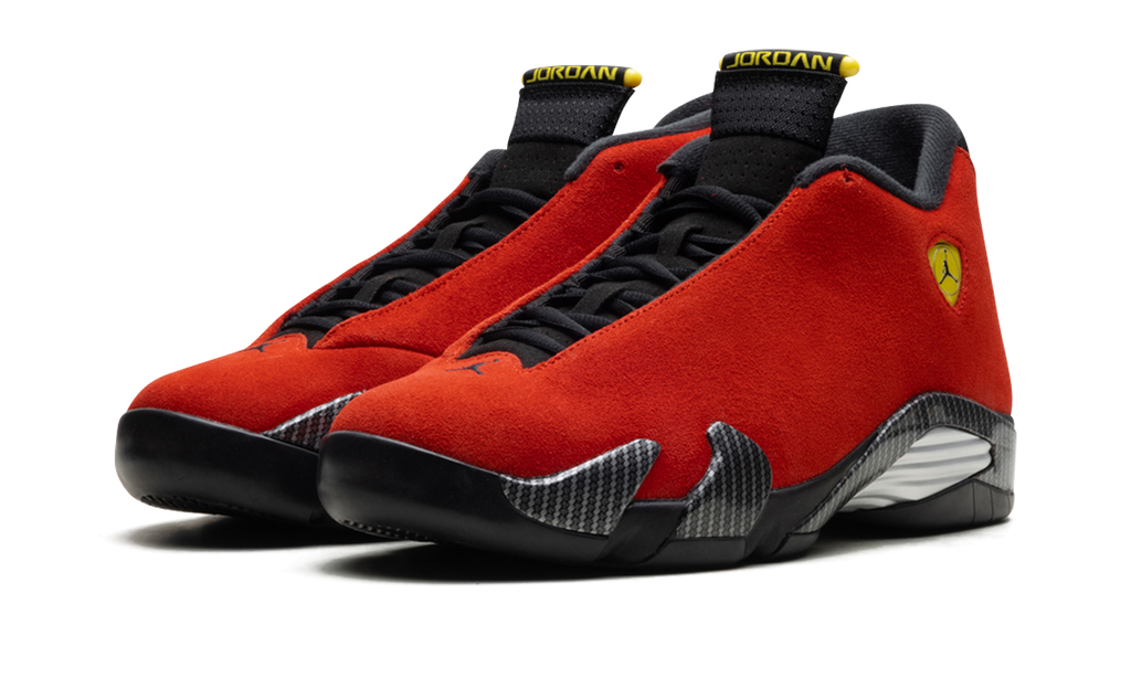 The Air Jordan 14 "Ferrari" is a 2025 colorway of Michael Jordan's 14th signature shoe. Inspired by Jordan's love of sports cars, the "Ferrari" AJ14 has a sleek red suede upper that is accented with carbon fiber-inspired details around the midsole. The texture on the heel tab is reminiscent of car tires, and yellow accents complete the design.
