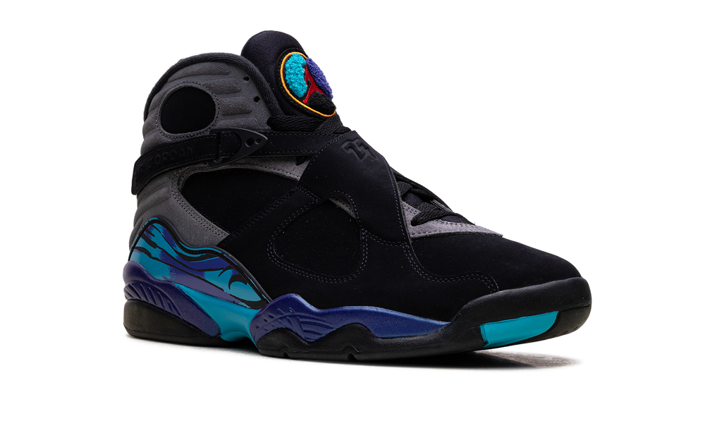 Make a vibrant statement with the unmistakable style of the Air Jordan 8 "Aqua." The bold black nubuck upper is highlighted by the iconic aqua and concord accents on the midsole and signature chenille tongue logo. The distinctive cross straps add to its standout look, making this colorful retro a must-have for any sneaker enthusiast.