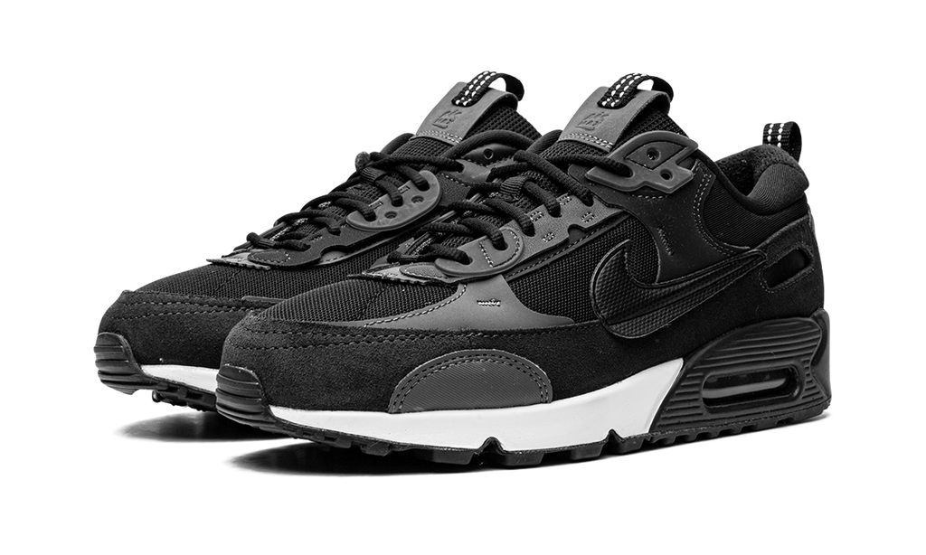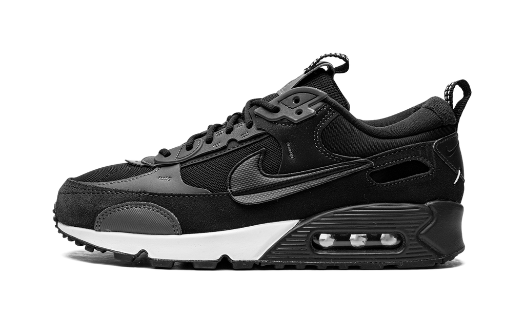 The Women’s Nike Air Max 90 Futura “Black” is a women’s-exclusive colorway of the future-forward version of the retro performance running shoe. The Air Max 90 Futura injects the classic sneaker with a contemporary edge, as it updates its design with a new arrangement of overlays, a modified Swoosh logo, and more. The shoe features a black textile base with tonal leather overlays on the forefoot and eyelets. A dark grey, oversized Swoosh is found on either side of the shoe and overlaps on the textile mudguard. “Air” branding appears on the black leather overlay found on the heel. The shoe retains the Air Max 90’s original midsole design.