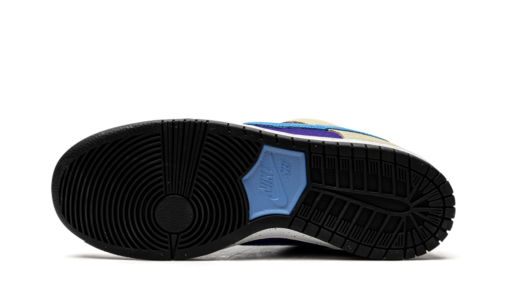 The Nike SB Dunk Low “ACG - Celadon” is a outdoors-inspired colorway of the low-top skate shoe that honors Nike’s ACG Terra silhouette that debuted in the early ‘90s. The “Celadon’s” throwback color block of purple, beige, and blue mimics the exact styling of the Nike ACG Terra of the same nickname. Purple suede forms the base of the shoe and appears on the perforated toe, mid-panel, collar, and heel. Beige suede can be found on the forefoot, eyelets, collar, and heel overlays. Nike constructs the suede Swoosh branding on both sides of the shoe in an attention-grabbing blue hue à la the Swoosh logo found on the ACG Terra “Celadon.” Dark beige “Nike” embroidery is stitched onto the heel and blue “Nike SB” and “Dunk Low Pro” insignia appear on the purple nylon tongue tag stitched onto the puffy purple mesh tongue. Dark tan laces and a white rubber midsole with black speckling complete the look of this rugged colorway inspired by Nike’s old school ACG performance footwear.