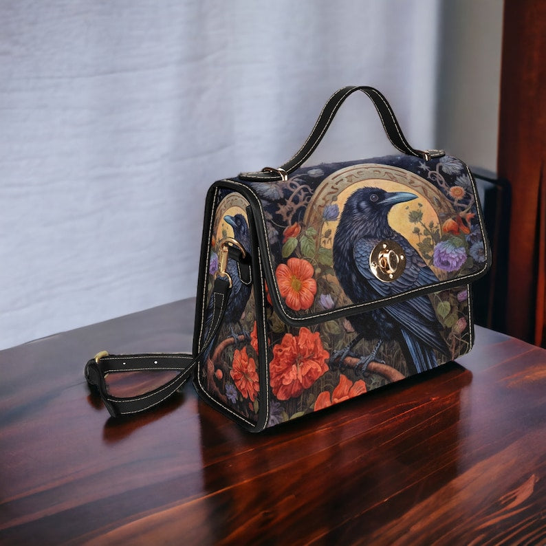 Emerald Blossoms - Dark Cottage Goth Witchy Crow and Floral Satchel Bag