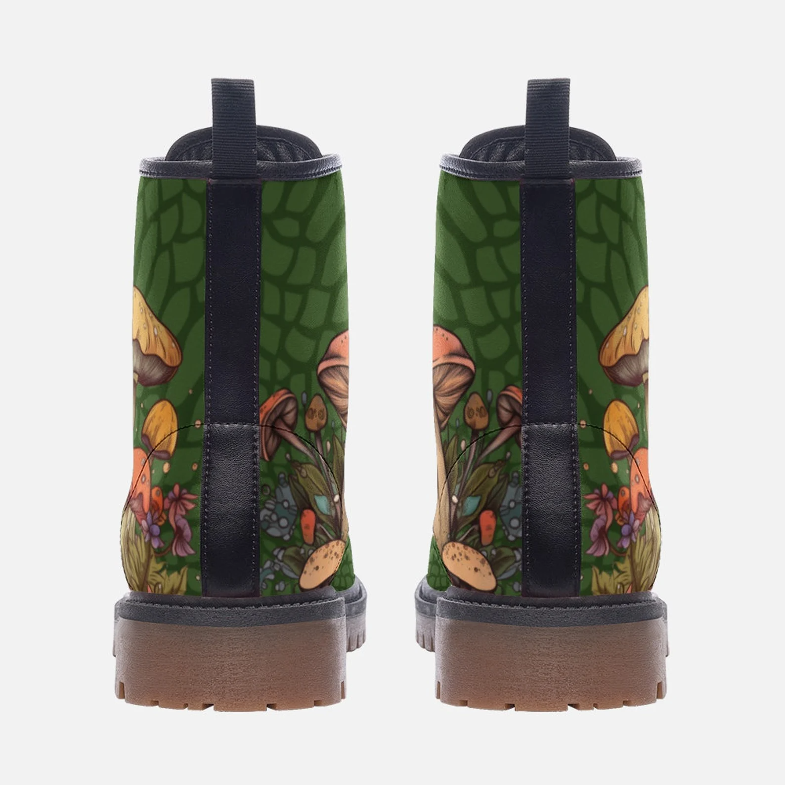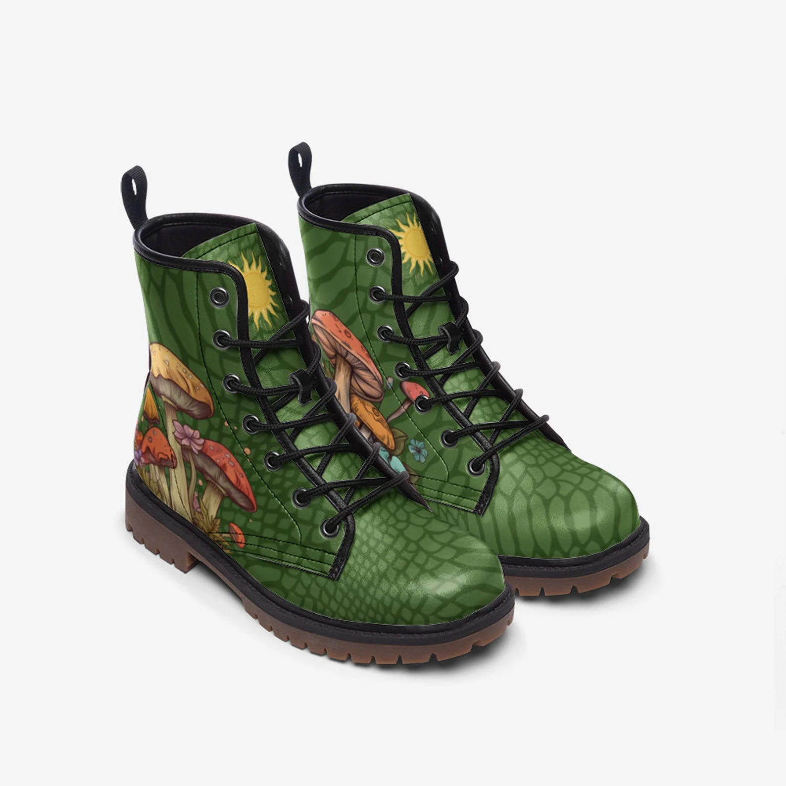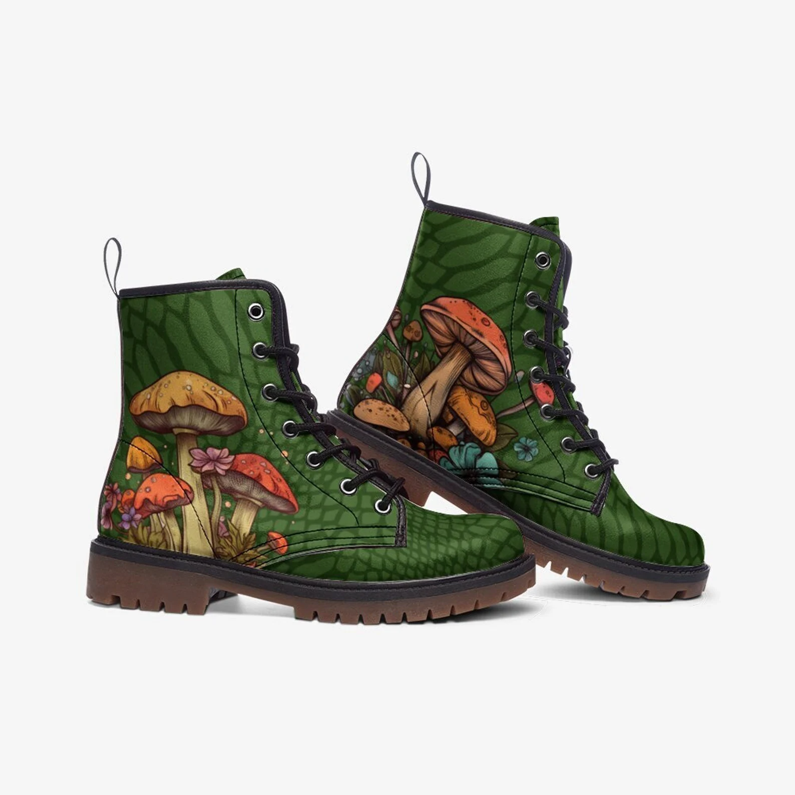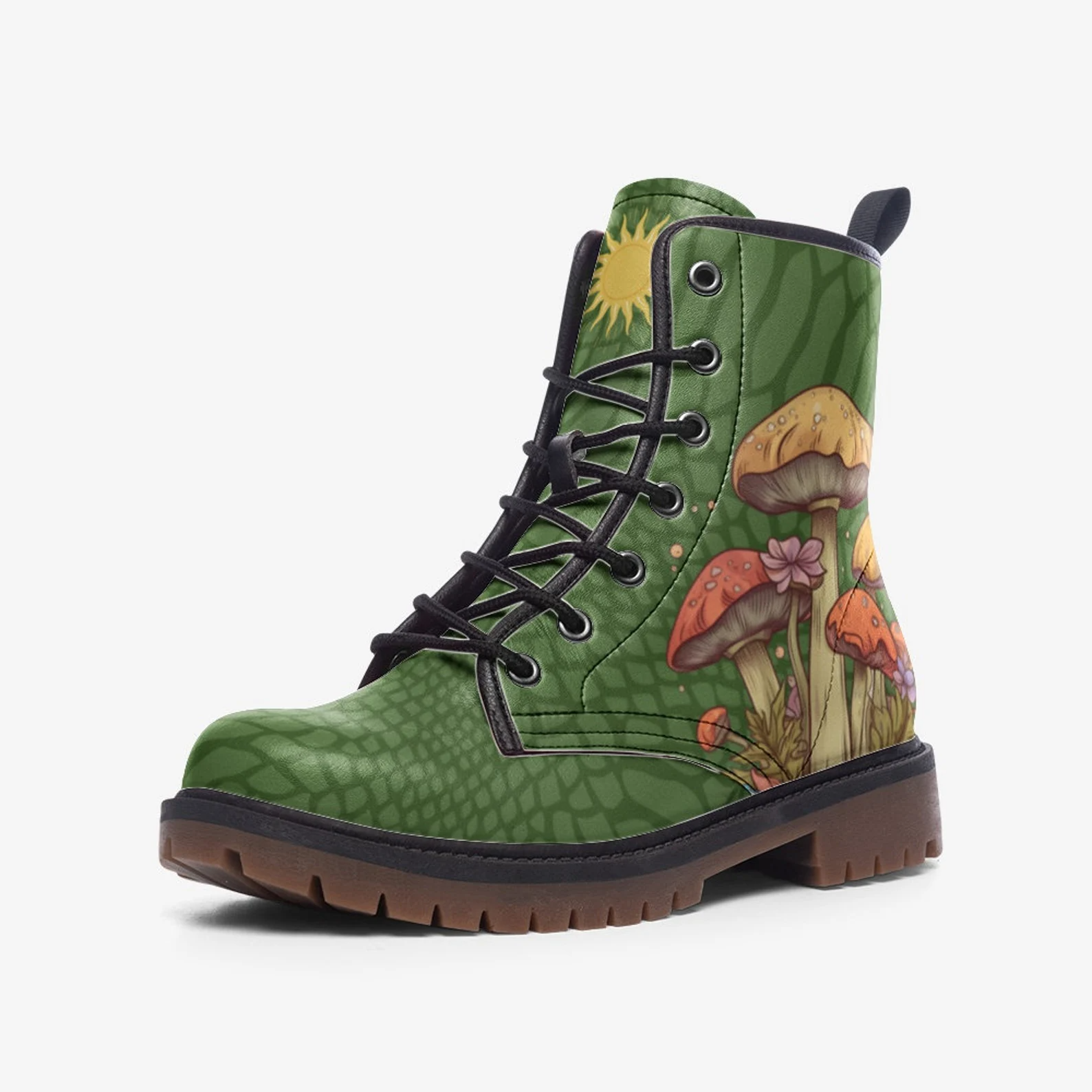 Emerald Blossoms - Green Mushroom Boots, Green Vegan Leather Lace Up Boots, Rave Shoes, Festival Combat Boots, Faux Leather Green Boots, Mushroom Shoes