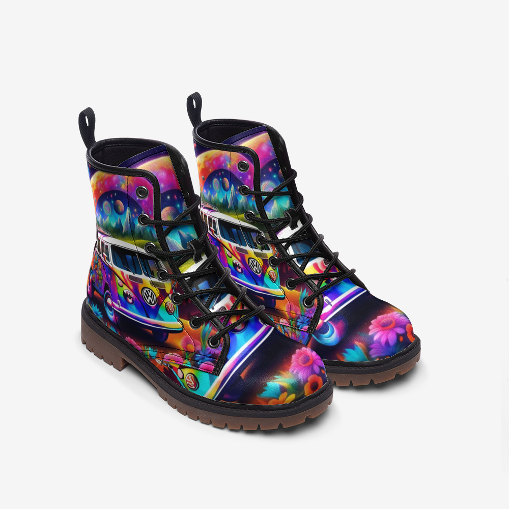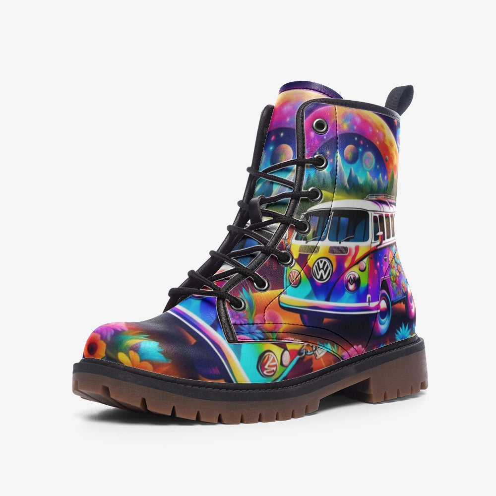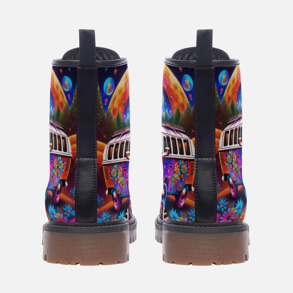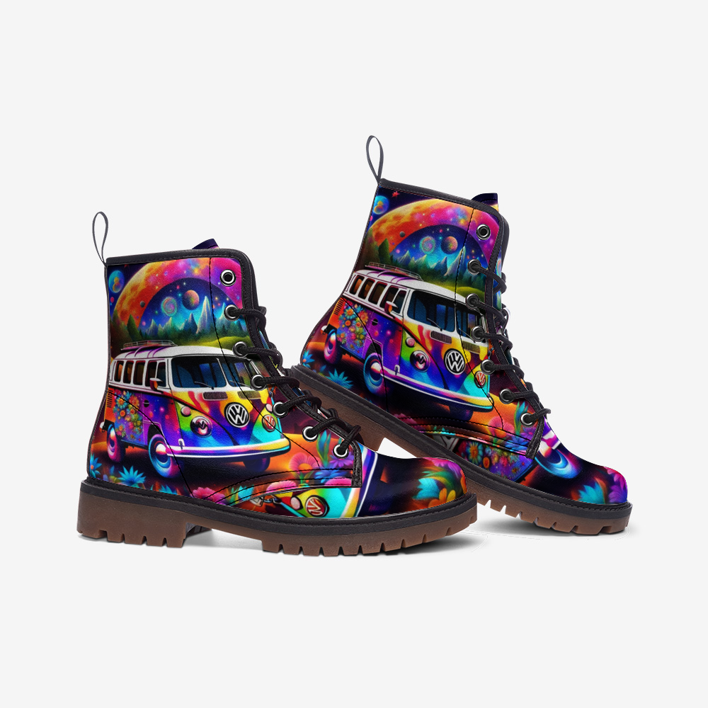 Celebrate vibrant freedom with the Emerald Blossoms Rainbow Color Hippie Van Casual Leather Boots. Featuring a bold rainbow print of a classic hippie van, these boots are a celebration of adventure and colorful self-expression. Crafted from soft, lightweight leather, they provide all-day comfort while making a bold fashion statement. Perfect for those who embrace a carefree, laid-back style, these boots infuse any outfit with a splash of fun and a touch of nostalgia. Hit the road in style and let your unique spirit shine!