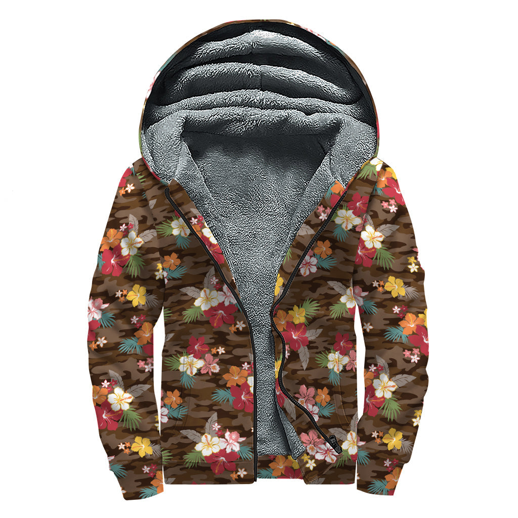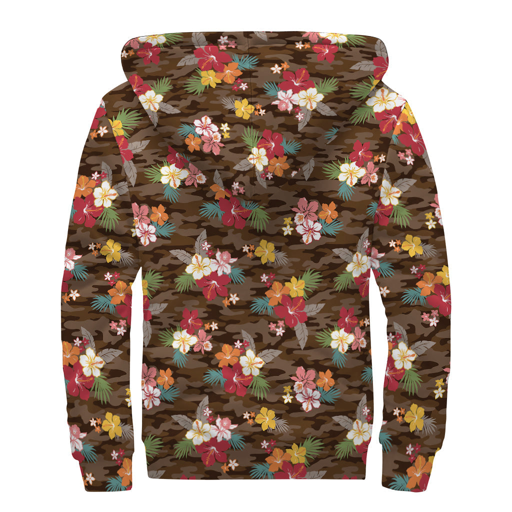 Groovy Vibes: Brown Camo Hibiscus Flower Print Sherpa Lined Zip Up Hoodie for the Free-spirited Hippie