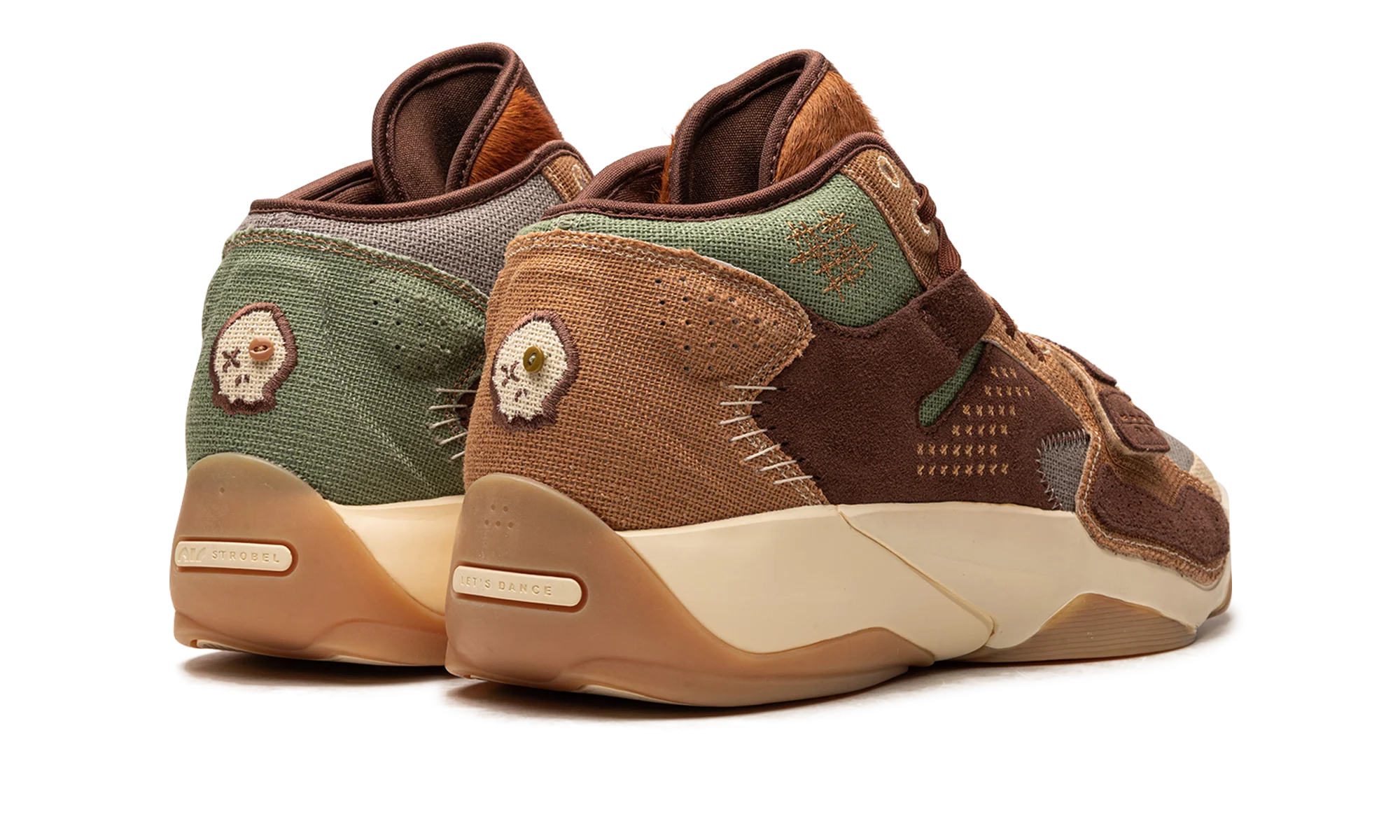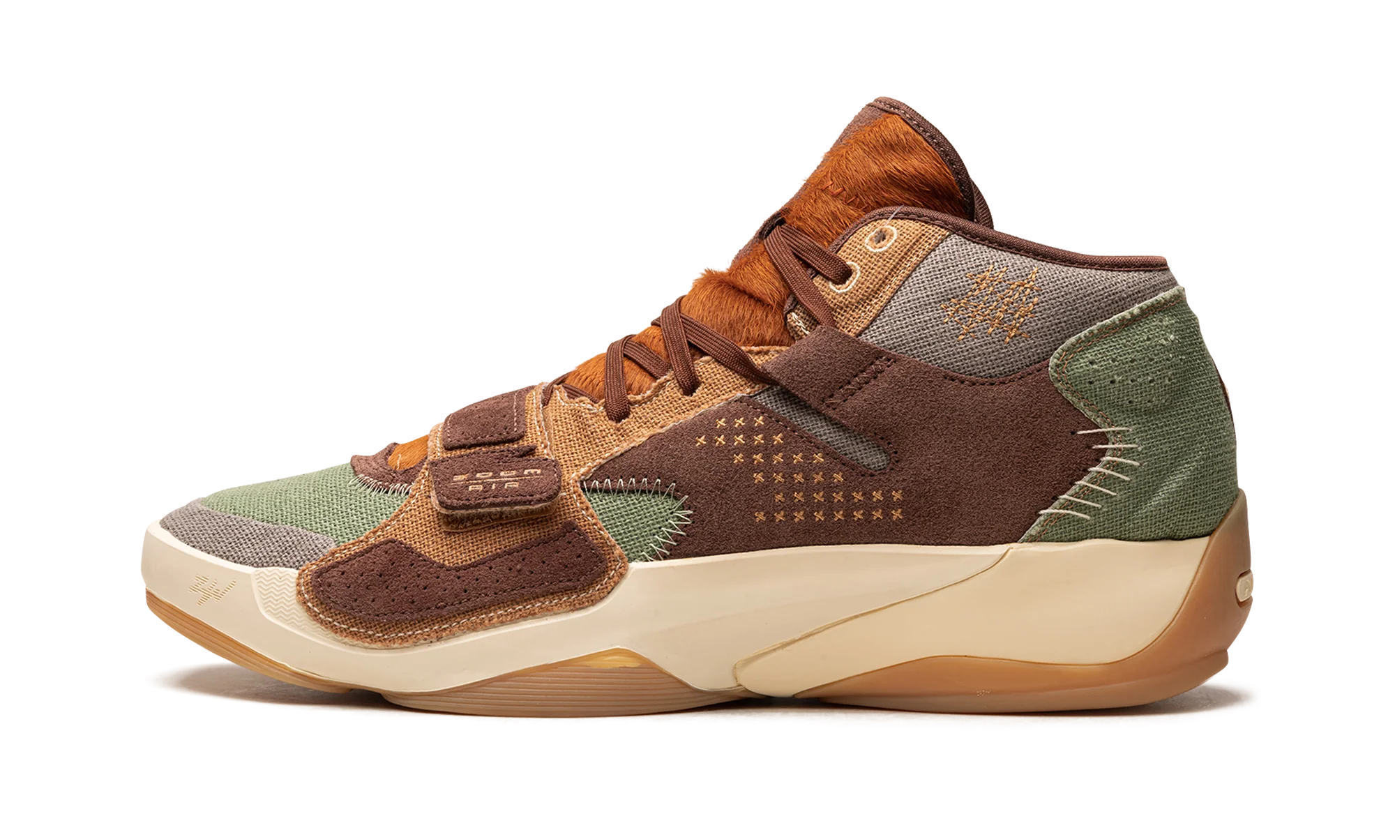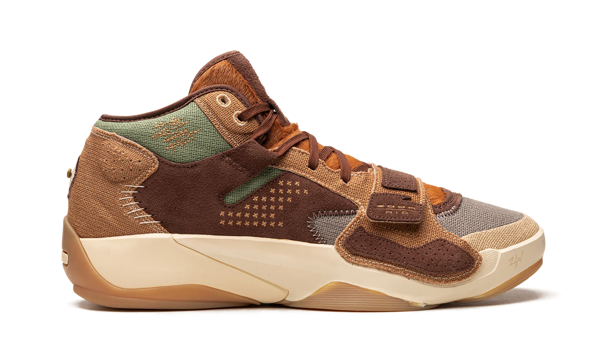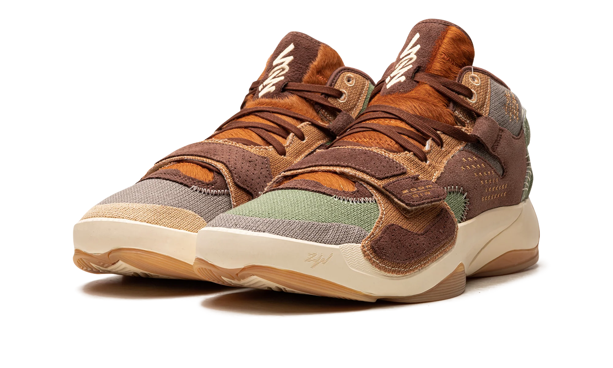 The Jordan Zion 2 “Voodoo” is a colorway of Zion Williamson’s second signature shoe with Jordan Brand inspired by the city of New Orleans. Released alongside an Air Jordan 1 Low of the same nickname, the Zion 2 “Voodoo” is undoubtedly inspired by voodoo dolls, a fixture of New Orleans’ lore. A mismatched color block is seen on the design. Specifically, olive green canvas is found on the toe, mid-panel, and heel of the left shoe while grey canvas is seen on the same areas on the right shoe. Burlap-like overlays are designed in a mismatched color block of green and brown on the heel of the left and right shoe, respectively. A voodoo doll-like character appears on the heel.
