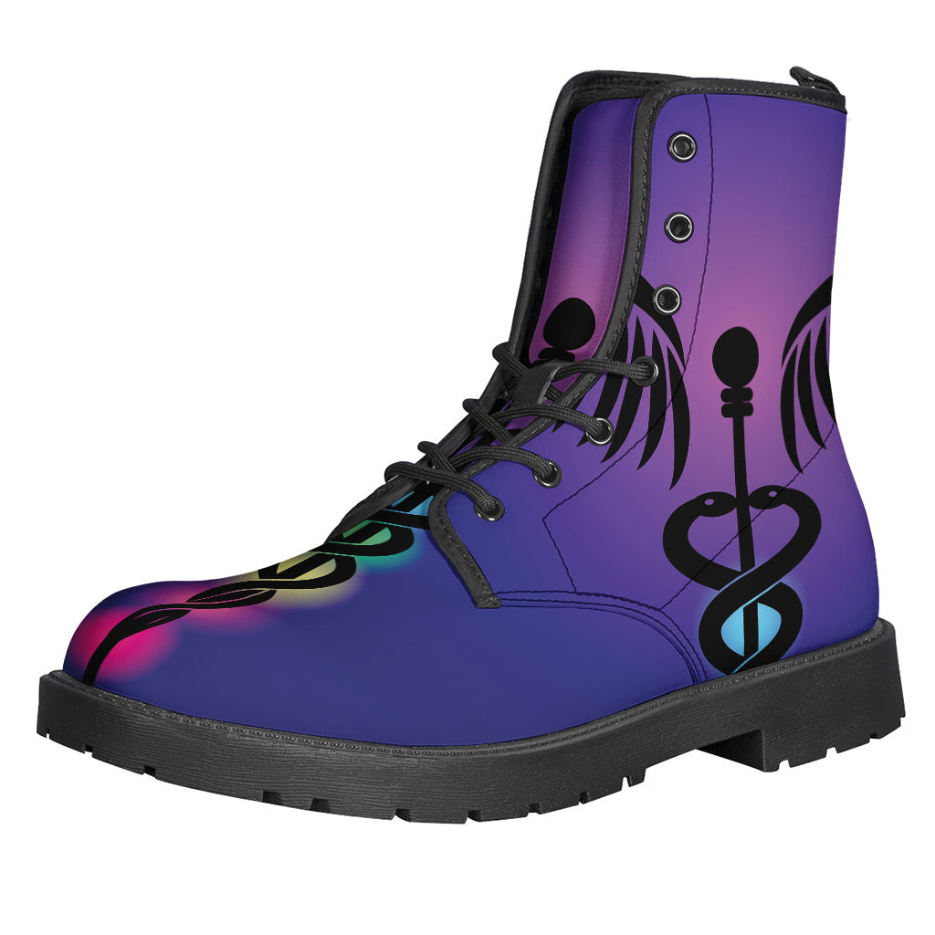 Embrace your inner groovy spirit with these Hippies Leather Lightweight Boots! These unique boots feature a vibrant 7 Chakras Caduceus print that is sure to make a statement wherever you go. Made from high-quality leather, these boots are not only stylish but also durable and comfortable for all-day wear. The lightweight design ensures ease of movement, perfect for any free-spirited adventurer. Whether you're heading to a music festival or simply want to add a touch of bohemian flair to your everyday look, these Hippies Leather Lightweight Boots are the perfect choice. Channel your inner flower child and step out in style with these trendy and eye-catching boots.
