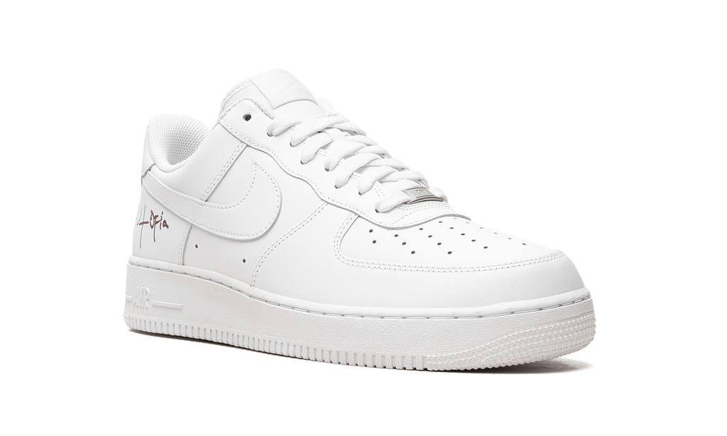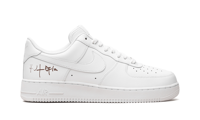 The Nike Air Force 1 '07 Women's "White" Utopia Edition is a special collaboration between Nike and rapper Travis Scott, celebrating his album "Utopia." This women's-exclusive sneaker features an all-white leather upper, accented with laser-etched "Utopia" and "Cactus Jack" branding on the lateral heel, for a clean, minimalist look. The design is completed with a white midsole equipped with Nike Air cushioning for comfort and a durable rubber outsole with pivot point traction for reliable grip. Releasing July 29, 2023,