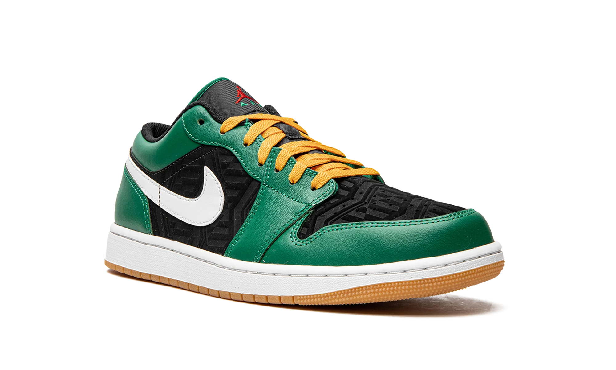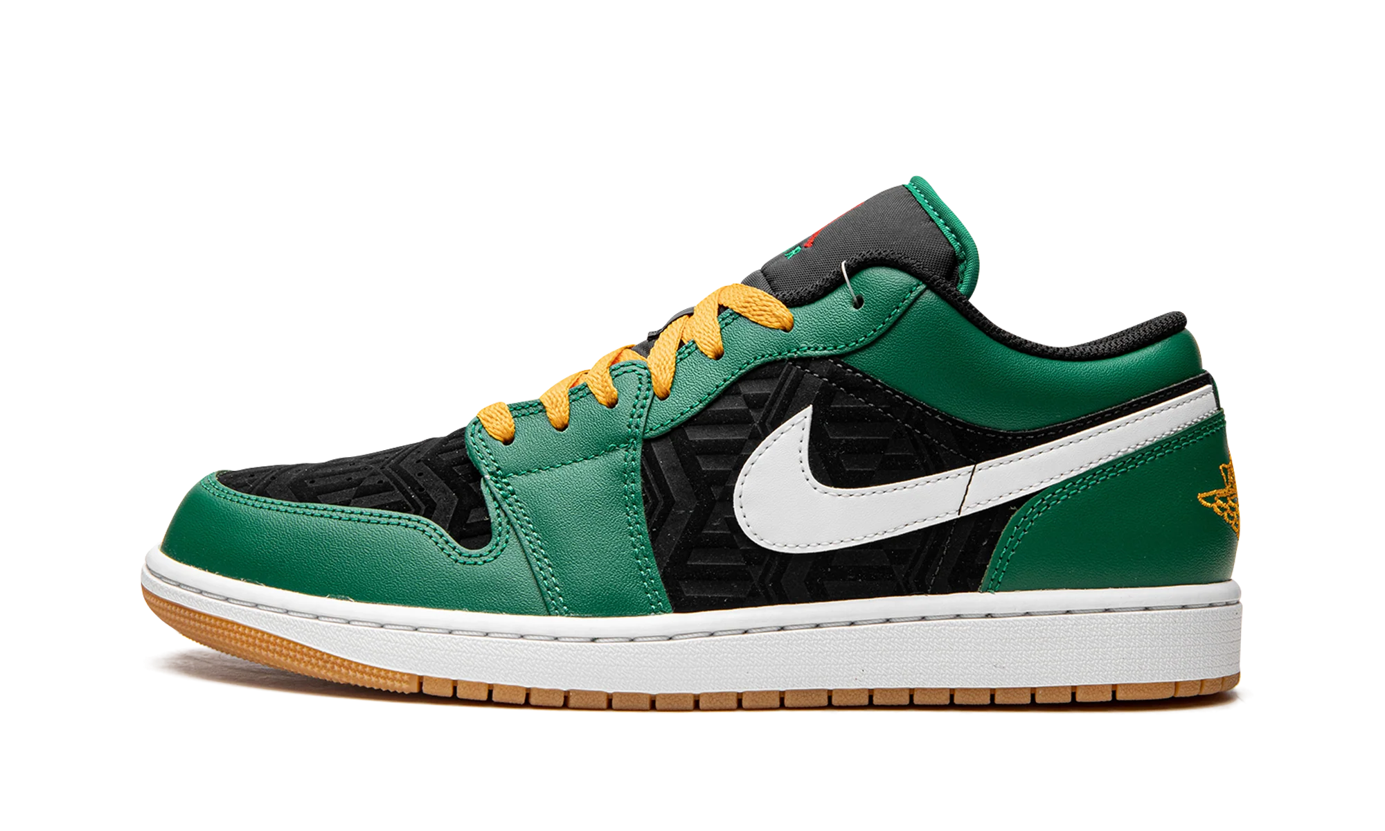 The Air Jordan 1 Low SE “Holiday Special” is a colorway of the lifestyle shoe inspired by the holiday season, specifically Christmas. The shoe features a black leather base with a subtle geometric pattern. Contrasting green leather overlays and a white leather Swoosh add to the look. A yellow “Wings” logo is embroidered on the heel and a red Jumpman is paired with green “Air” branding on the black nylon tongue. The shoe’s yellow laces add a pop of color to the design. Underfoot, a white midsole and gum rubber outsole complete the look.