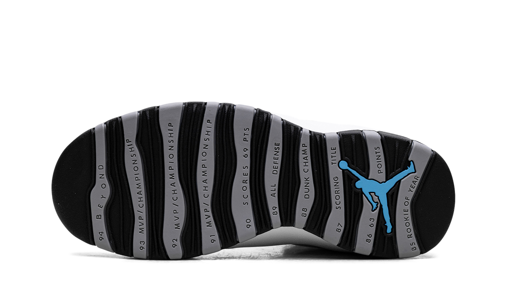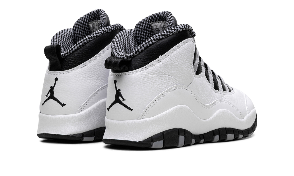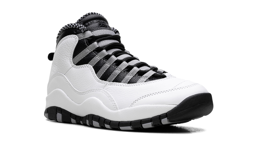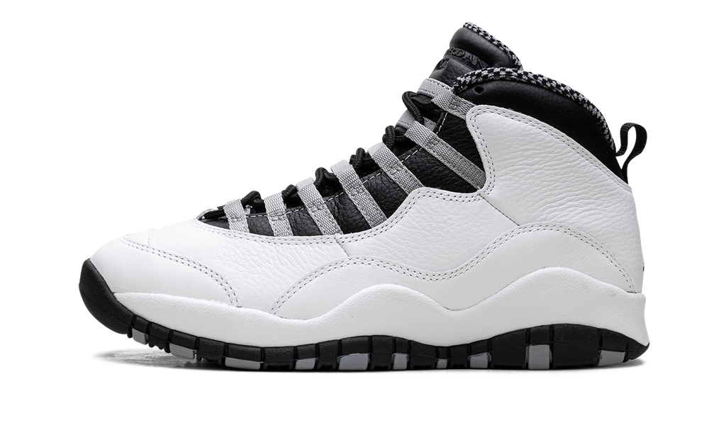 Elevate your sneaker game with the Air Jordan 10 "Steel." This iconic shoe offers a blend of heritage design and clean appeal, highlighted by its sharp grey and black details against a white base. It's a stylish and comfortable choice for any fan who appreciates classic Jordan aesthetics.