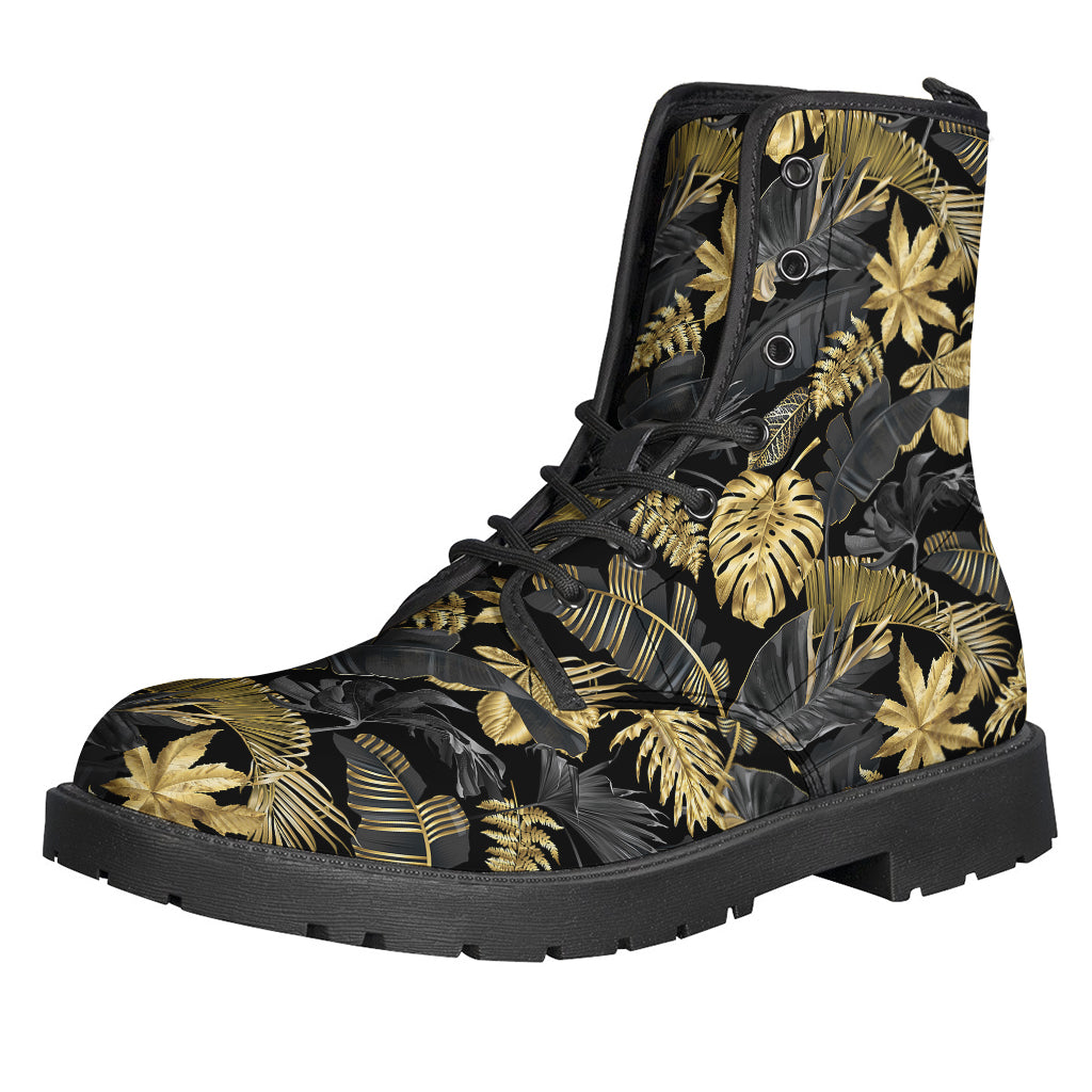 These black and gold tropical pattern print leather boots are the perfect choice for hippies who want to make a statement with their footwear. The lightweight design and comfortable fit make them ideal for long days of adventuring and dancing at music festivals. The unique tropical pattern print adds a touch of bohemian flair to any outfit, while the durable leather construction ensures these boots will last for many seasons to come. Whether you're exploring the great outdoors or hitting the streets in style, these hippie leather boots are sure to turn heads wherever you go.